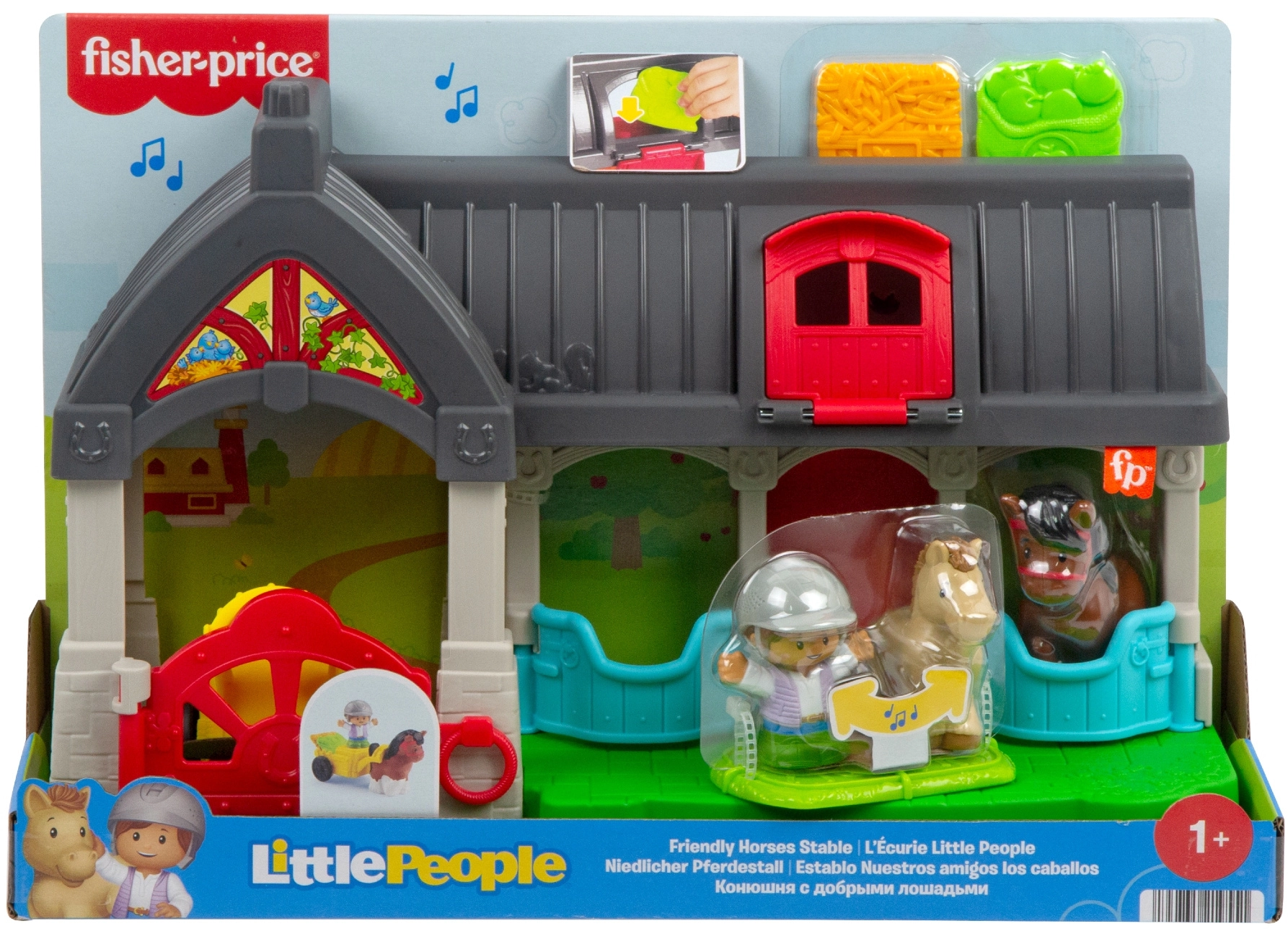 De vrolijke Little People-stal brengt de dierenwereld binnen handbereik. Twee gescheiden secties om te verkennen, openende boxdeuren en een speciale opening om te “voeren” maken van elk spel een nieuw verhaal. Kinderen kunnen het grotere paard inspannen voor de aanhangwagen, “hooi” vervoeren en voor hun paardjes zorgen met behulp van de verzorgerfigur.