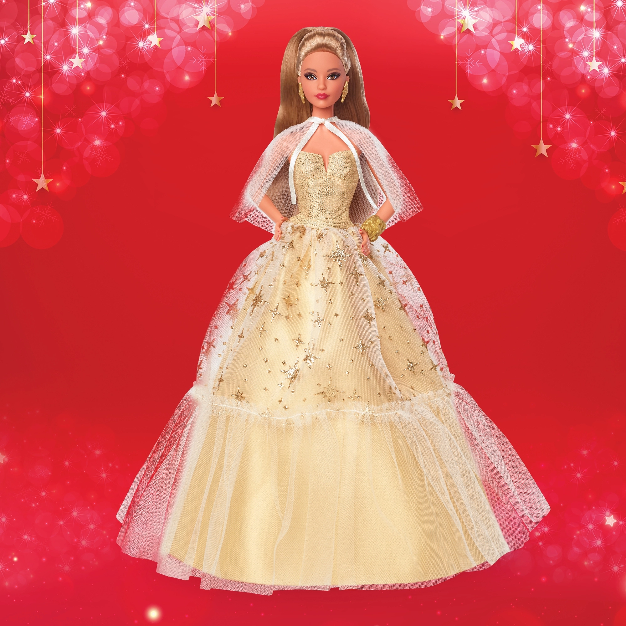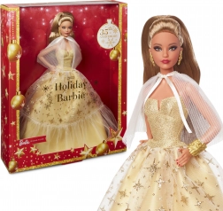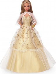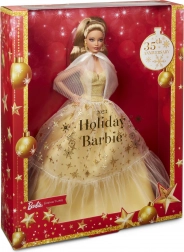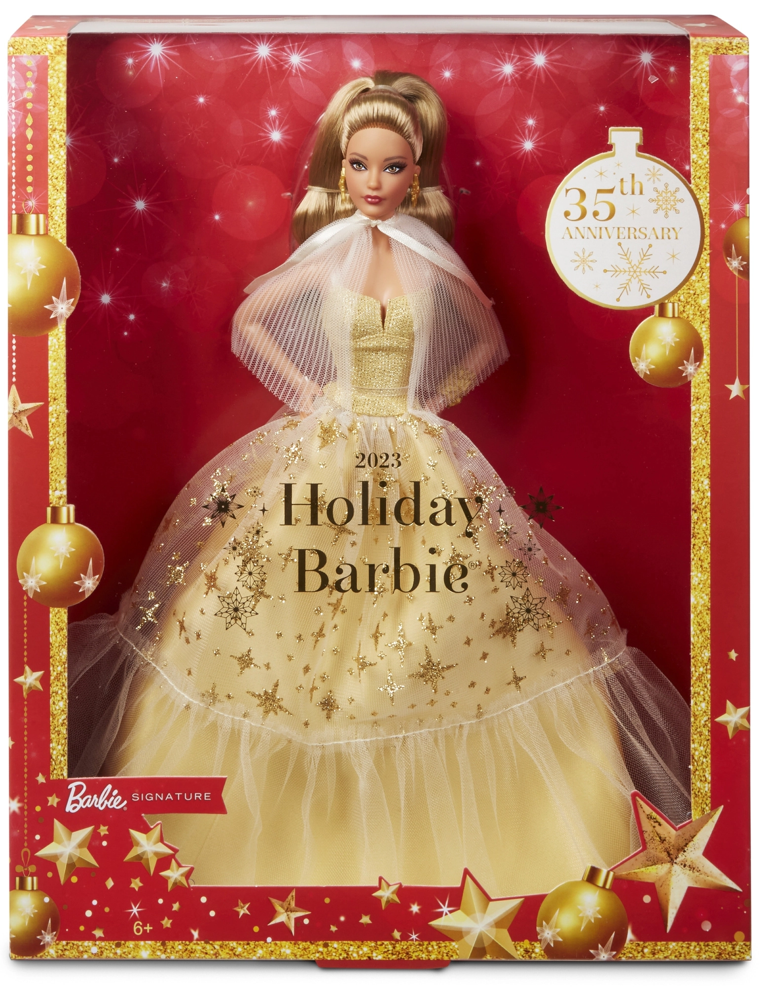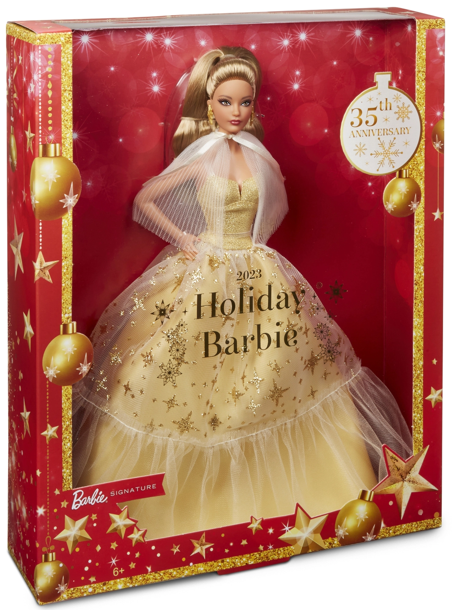 Elegante verzamelpop BARBIE ter ere van het 35-jarig jubileum in een satijnen jurk in champagnekleur met een tule rok bezaaid met gouden sterren. Inclusief een geplooide, transparante cape, gouden sieraden en verfijnde details in make-up en manicure. Ideaal als kerstcadeau en een pronkstuk voor elke collectie.