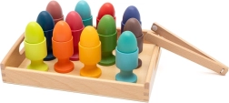De houten pincet motiveert kinderen tot een precieze greep en het overzetten van de eitjes in de bekertjes, waardoor vingers en oog-handcoördinatie worden versterkt.