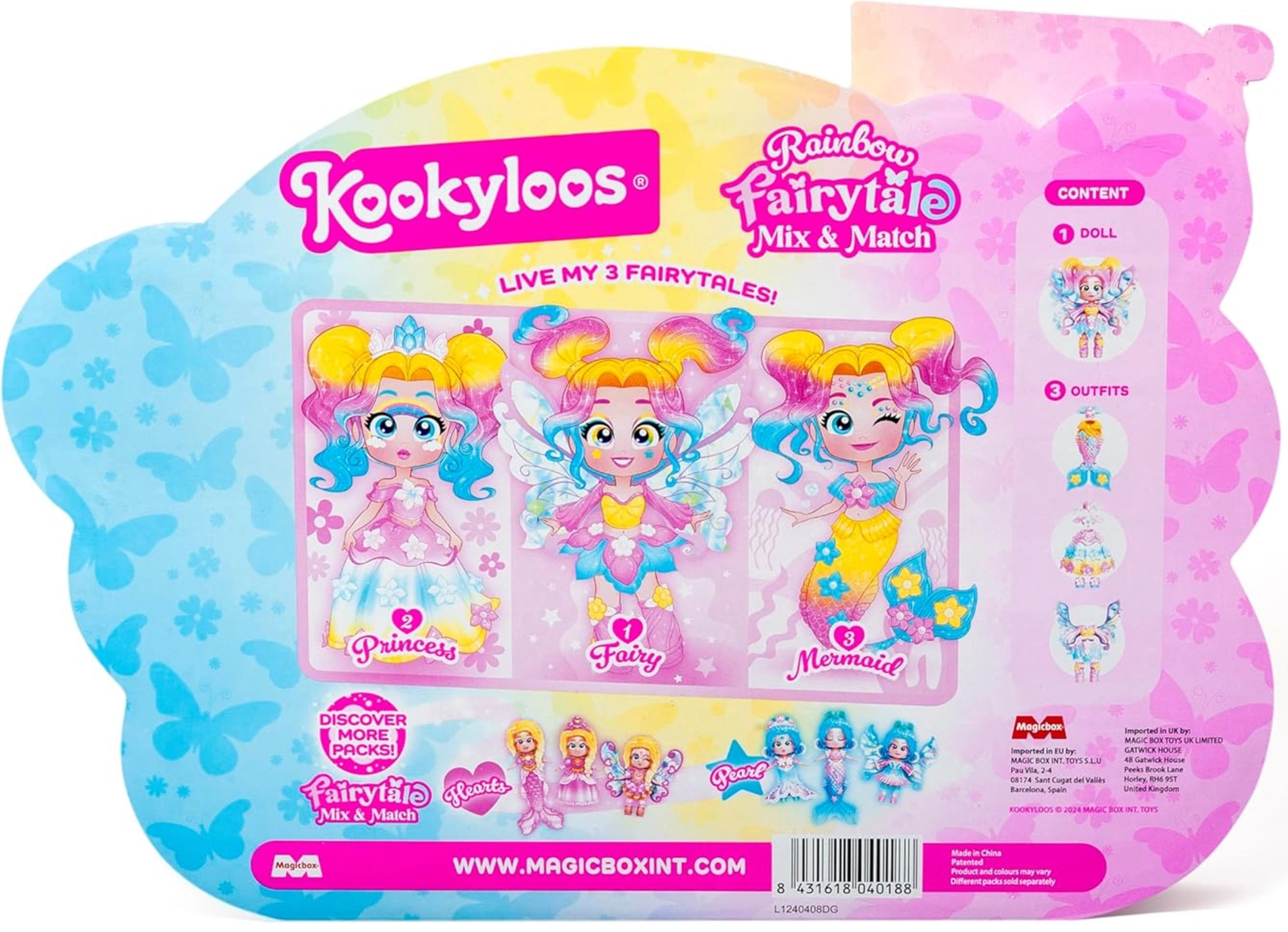 Ontdek de magische wereld van KookyLoos met de Fairytale Rainbow 3-in-1 figuur! Eén pop met verwisselbare gezichtsuitdrukkingen, mix & match outfits en drie rollen – prinses, fee en zeemeermin. Dankzij de bewegende gewrichten, glinsterende accessoires en compatibele onderdelen is dit de perfecte keuze voor creatief spel en verzamelplezier.