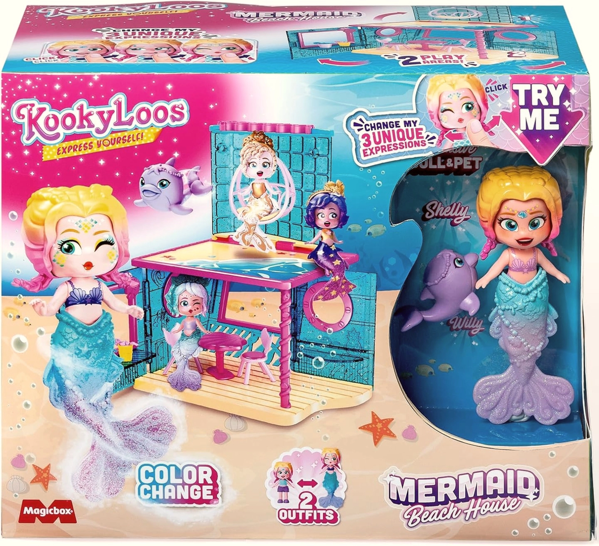 Ontdek de magische wereld van KookyLoos met het figuurtje Shelly en haar strandhuisje voor zeemeerminnen. Deze speelse set biedt kleurverandering in water, 3 gelaatsuitdrukkingen met één klik en volop modieuze accessoires voor creatief mix & match. Ideaal cadeau voor kinderen die dol zijn op fantasie, verzamelen en stijl.