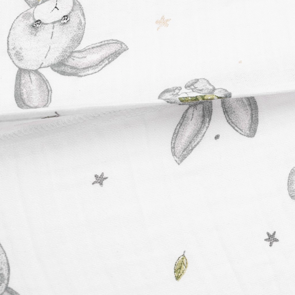 De stijlvolle en functionele NEW BABY hoes van zachte katoenen mousseline zorgt voor een rustige en comfortabele slaap voor je kleintje. Het materiaal is uitzonderlijk zacht, luchtig en aangenaam aan de huid, ideaal ook voor de allerkleinsten. Het moderne design met het schattige Bunny-motief past prachtig in elke kinderkamer.