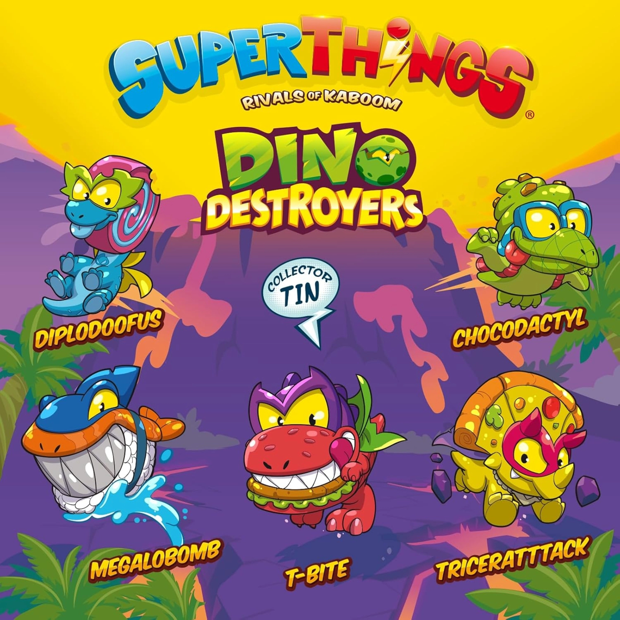 Ontdek de verzamelsensatie SuperThings Dino Destroyers in een elegante zilveren blik. Binnenin vind je 5 exclusieve figuren die je nergens anders vindt, en een metalen verpakking die ideaal is voor het bewaren van je collectie. De set combineert prehistorische dinothema’s met eten en biedt plezier, displaymogelijkheden en verzamelwaarde voor fans van Kaboom City.