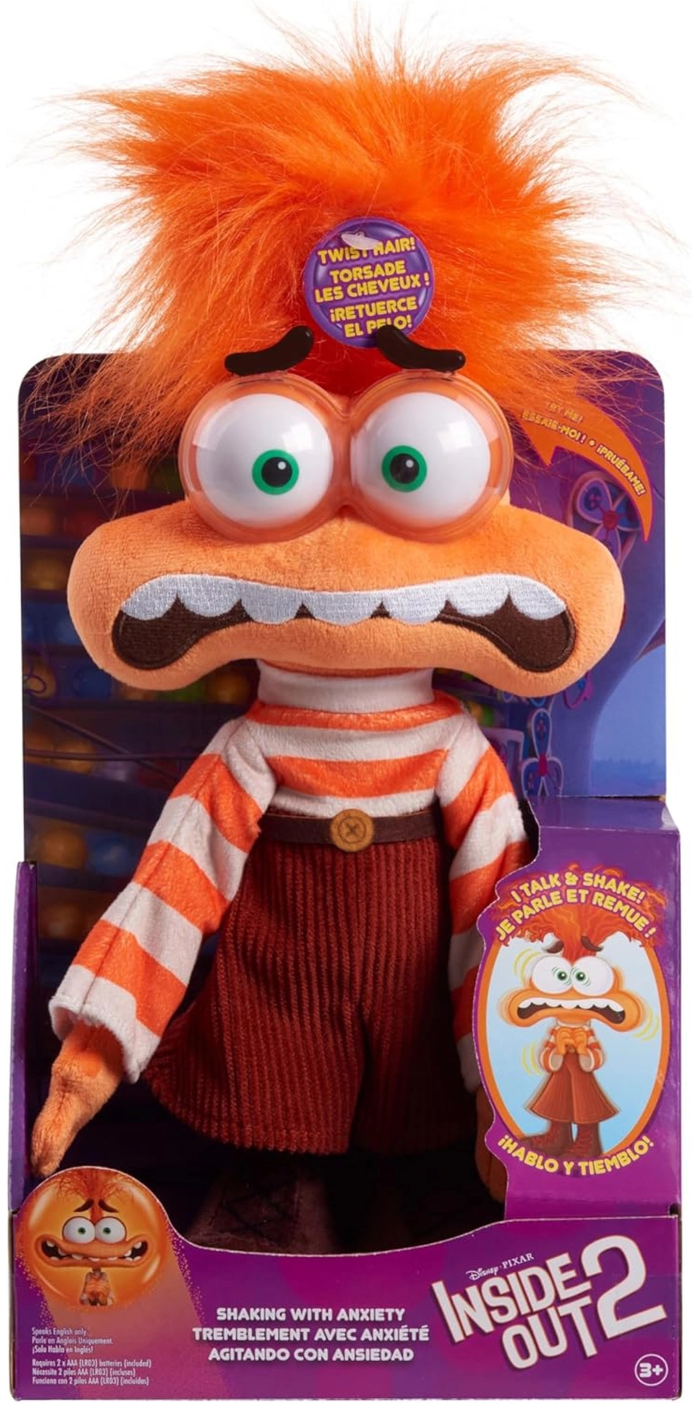 Een schattige interactieve knuffel van het personage Angst (Anxiety) uit de film Inside Out 2 verrukt kinderen met zijn effecten en uiterlijk. Wanneer je het hoofdje draait, trilt de knuffel en speelt Engelstalige zinnetjes af. De zachte afwerking, heldere kleuren en zachte haartjes nodigen uit om te knuffelen en creatief te spelen, thuis en onderweg.