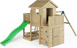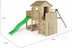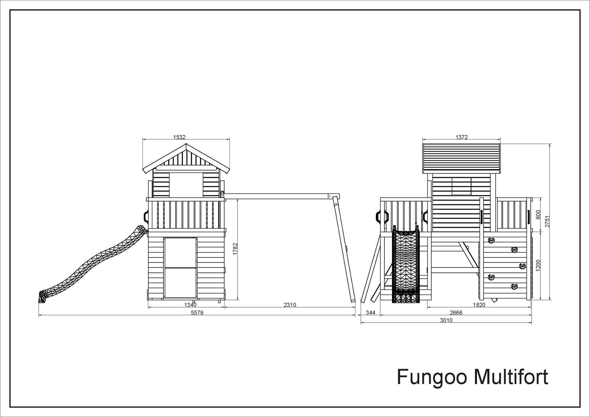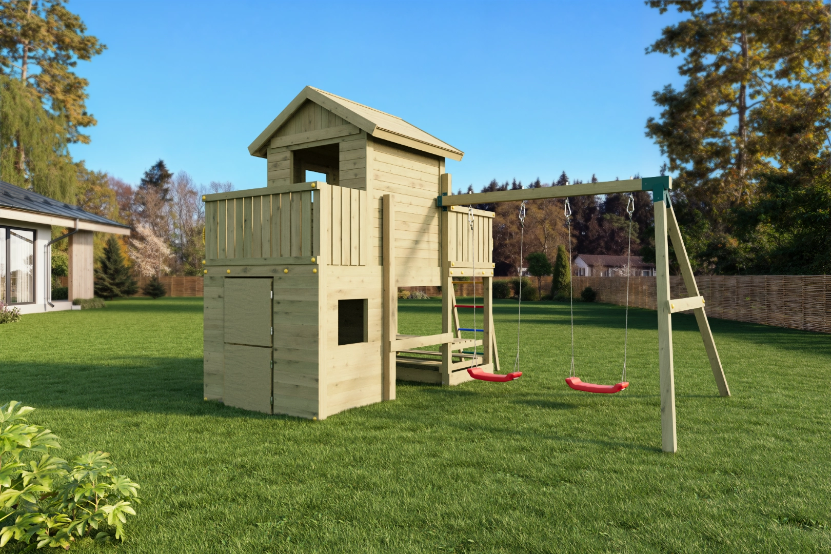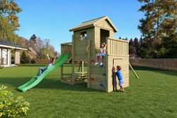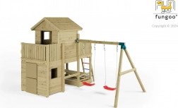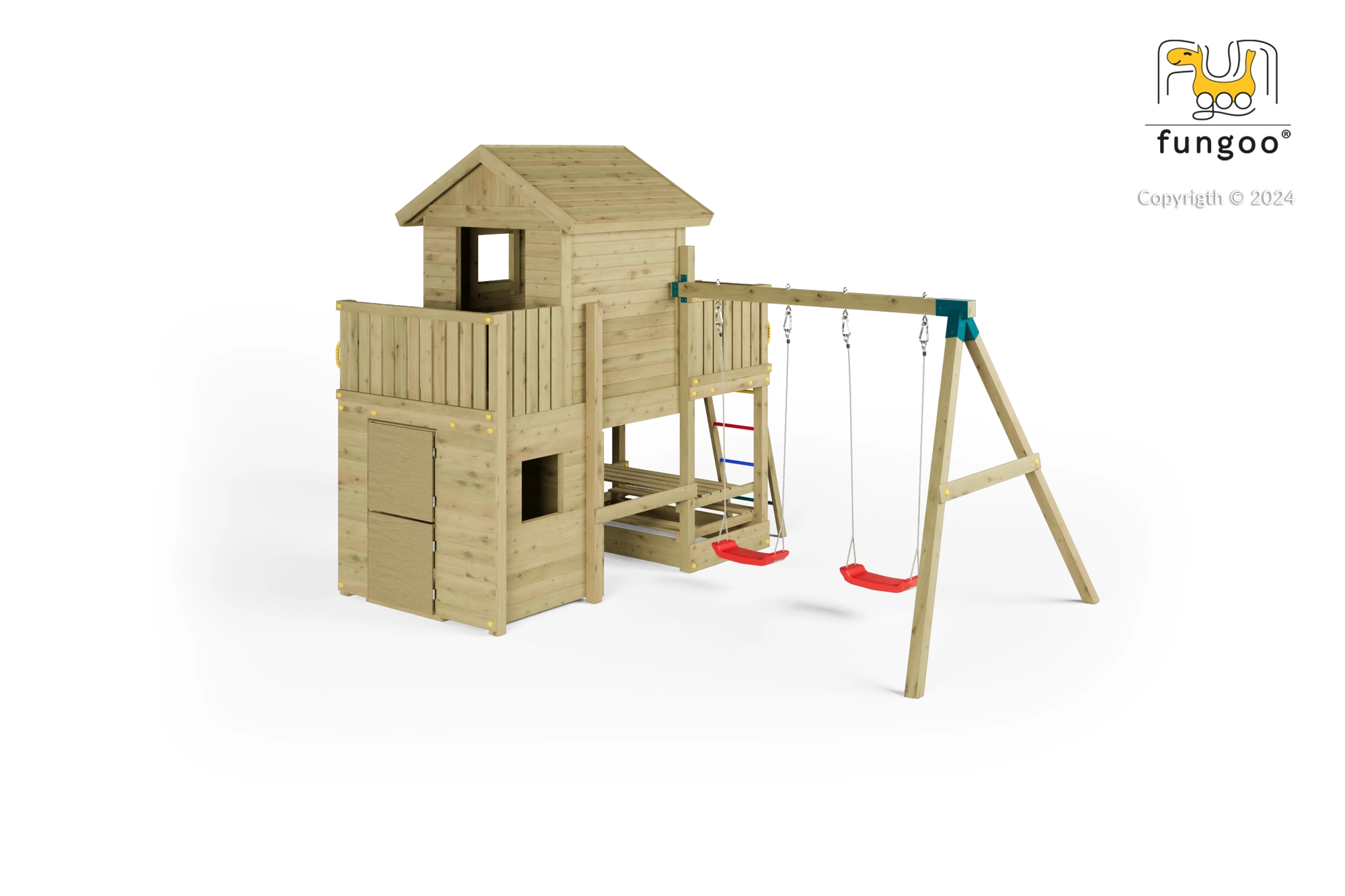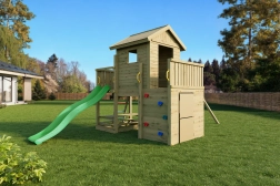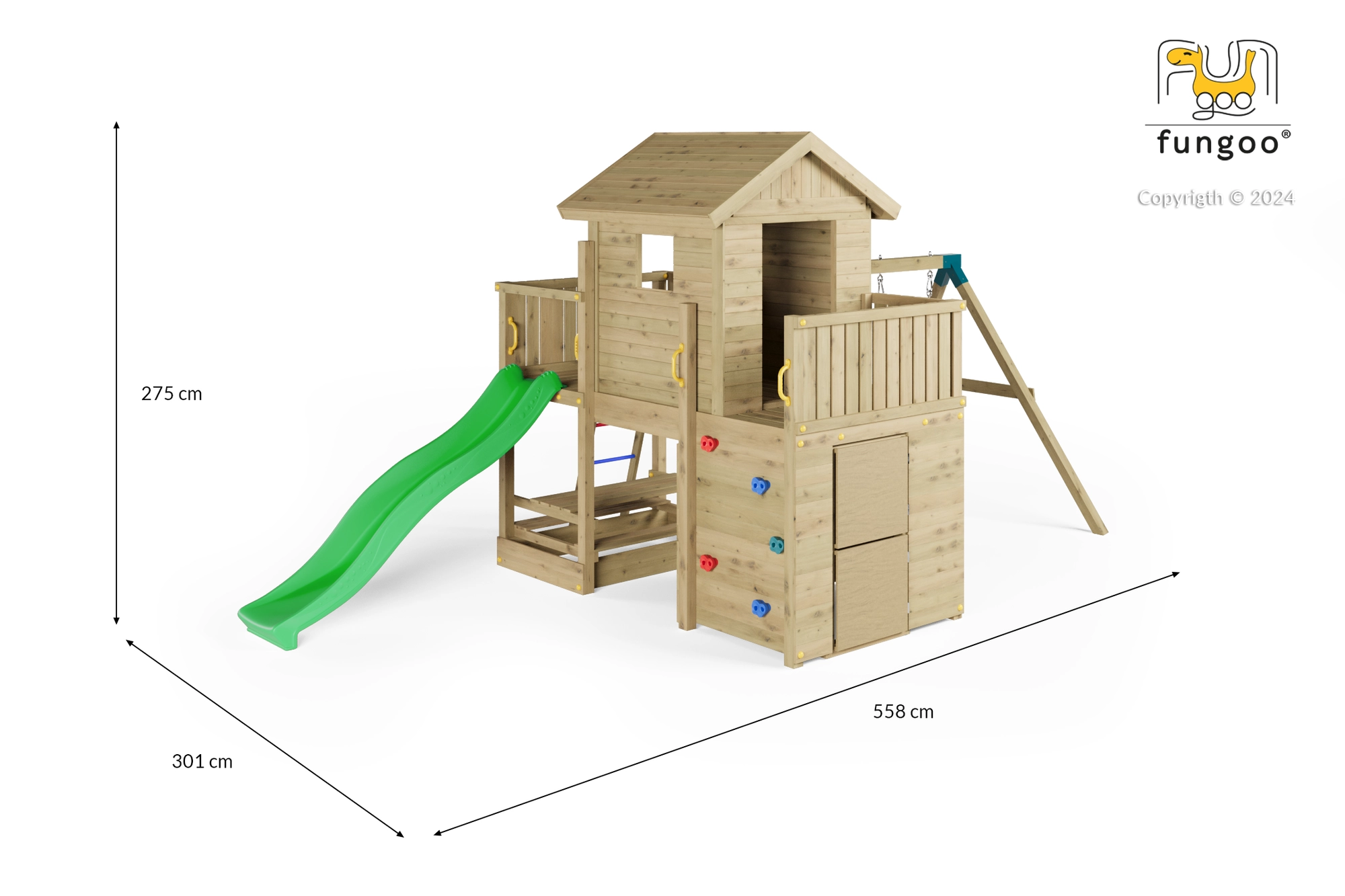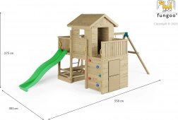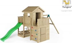 De FUNGOO Multifort KDI speeltuin brengt kinderen een veelzijdige wereld van beweging en fantasie, direct in je tuin. De stabiele houten constructie met huisje en dak biedt schaduw en beschutting, terwijl de glijbaan, klimwand en dubbele schommel uitnodigen tot dagelijks plezier. De KDI-drukimpregnering verhoogt de weerstand van het hout tegen vocht en weersomstandigheden.