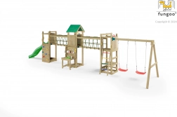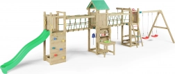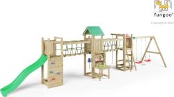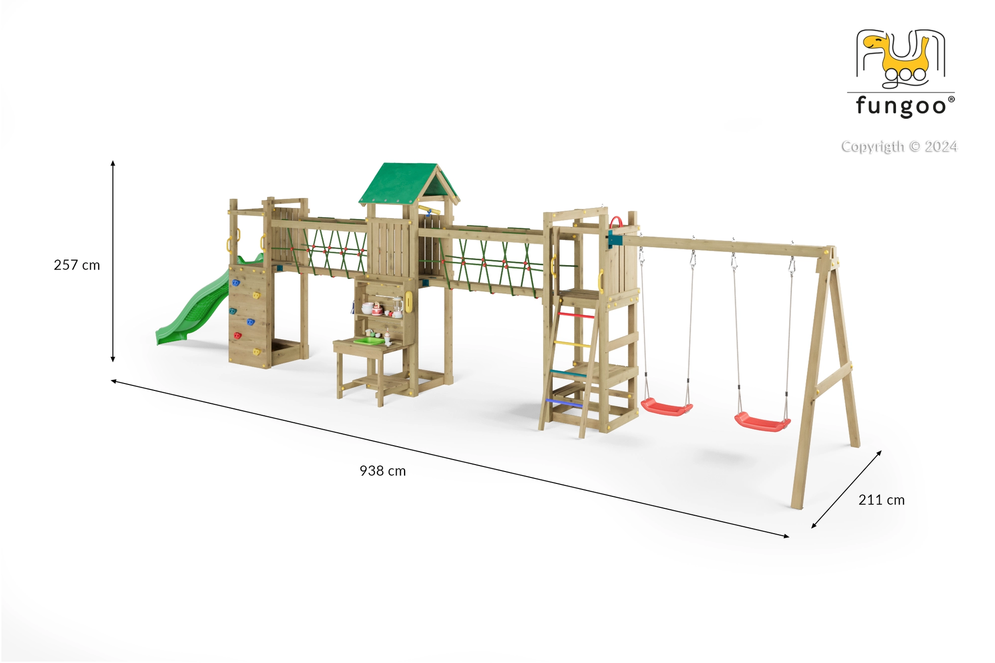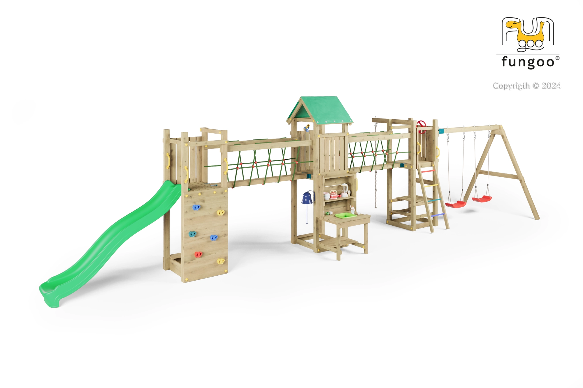 De groene glijbaan van 220 cm zorgt voor snelle en veilige afdalingen, terwijl de touwbrug bij elke stap balans en coördinatie traint.
