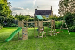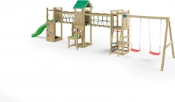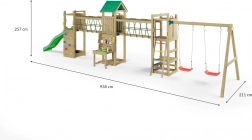 Het speeltoestel is ontworpen voor lange uren actief speelplezier in de buitenlucht. De houten toren met dak biedt schaduw en beschutting, de touwbrug traint coördinatie en de klimwand met grepen en touw ontwikkelt kracht en behendigheid. De glijbaan van 2,2 m zorgt voor snelle ritjes, terwijl de twee schommels kinderen van alle leeftijden blij maken.