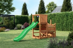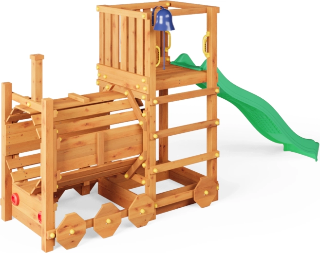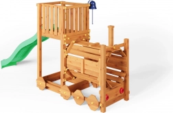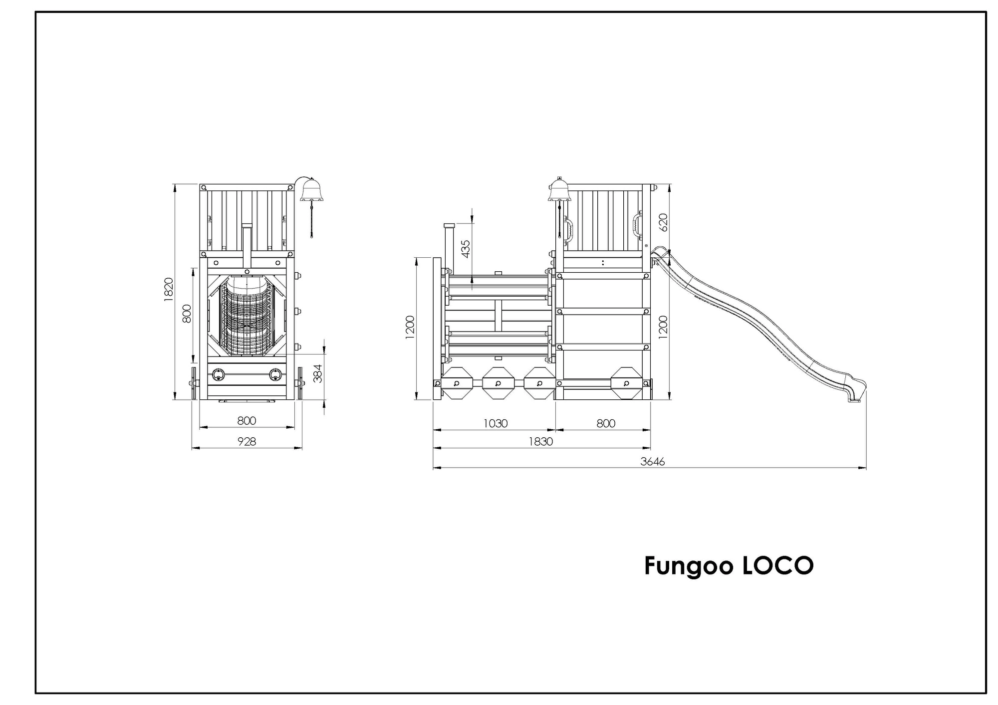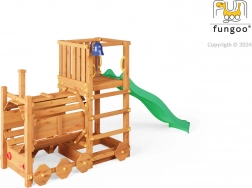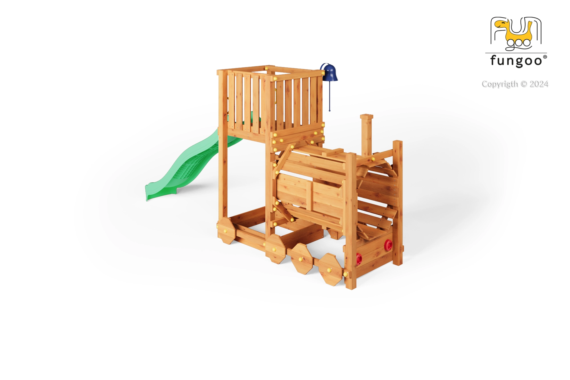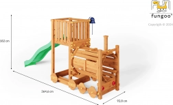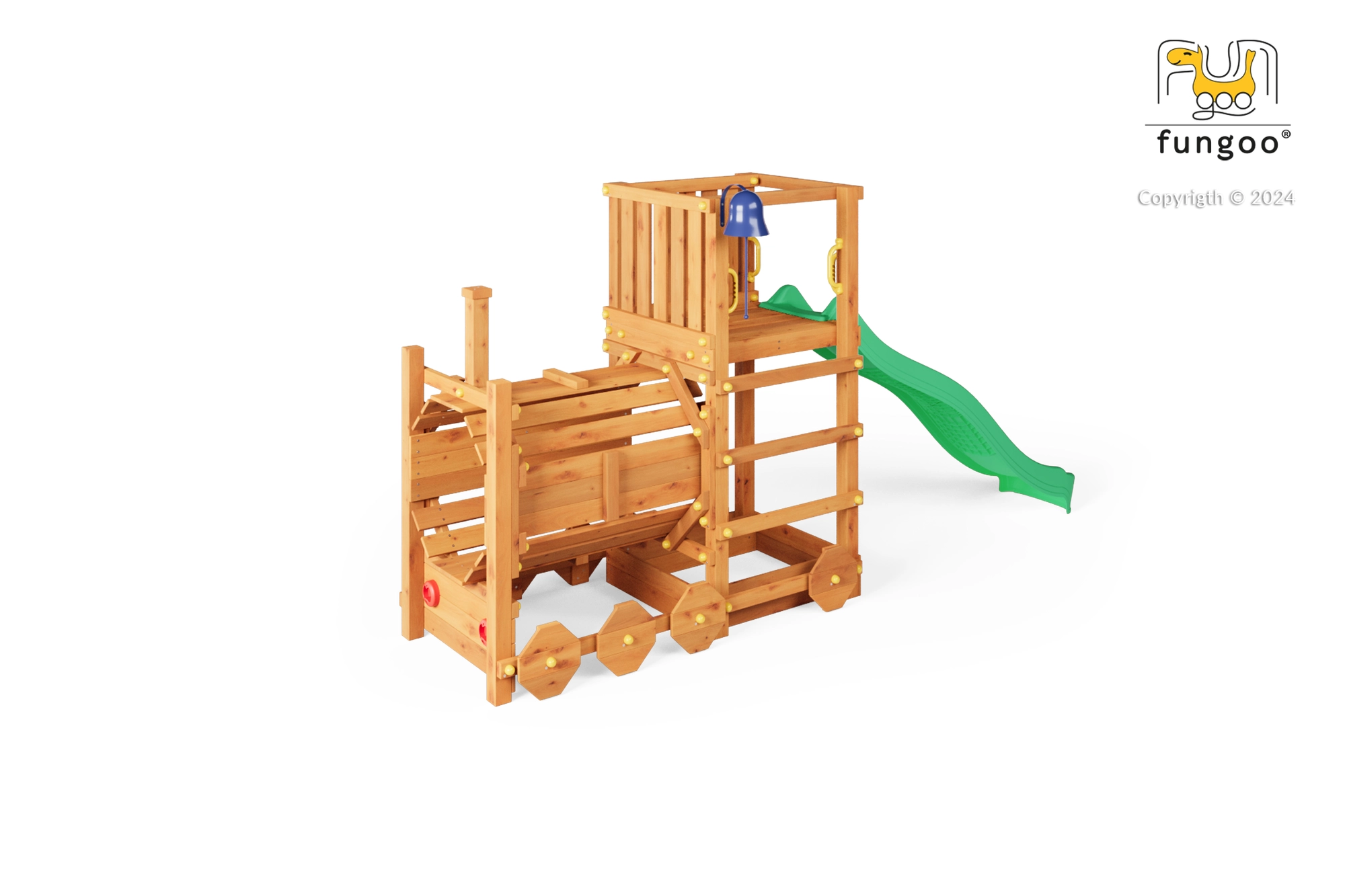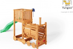 Het FUNGOO Loco speeltoestel is ontworpen als een locomotief met tunnel, die uitnodigt tot kruipen, verstoppen en rollenspel als machinist. De lange golfglijbaan van 2,2 m staat garant voor veel glijplezier, terwijl de bel de verbeelding en interactieve spelmomenten stimuleert. De constructie van hoogwaardig, geïmpregneerd hout is weerbestendig en stevig in de grond verankerd.