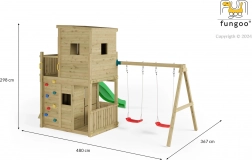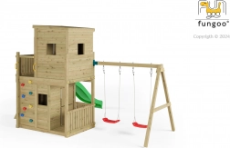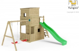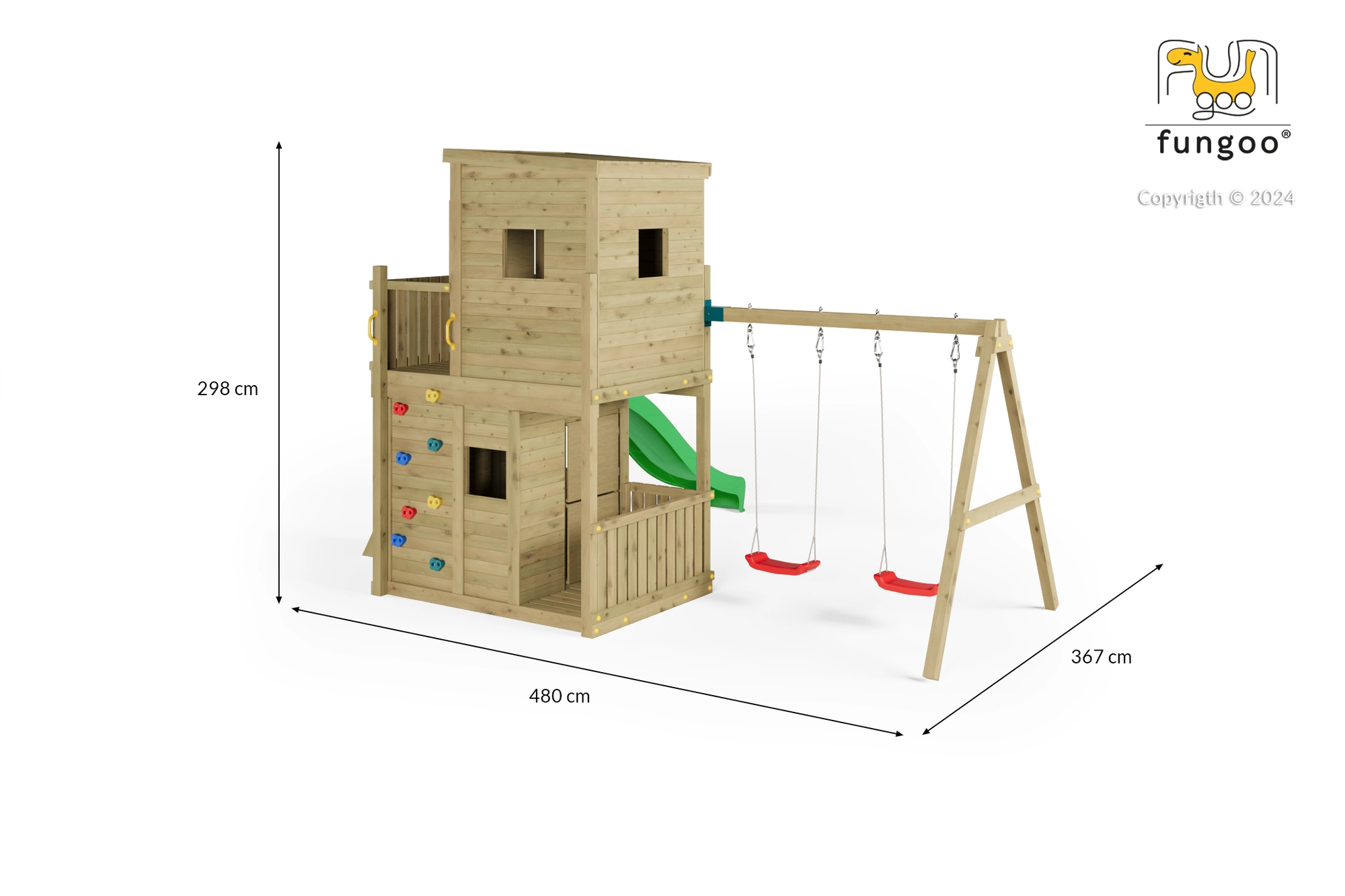 De FUNGOO Lofter combineert een stabiele houten constructie met rijke uitrusting voor veelzijdig speelplezier: een hoog speelhuis met dak en deurtjes, een golvende glijbaan van 2,9 m, een klimwand met grepen, comfortabele trapopgang en een frame met twee schommels. Dankzij kwaliteitsverbindingen, veiligheidsbeugels en grondankers staat alles stevig verankerd en klaar voor dagelijks gebruik.