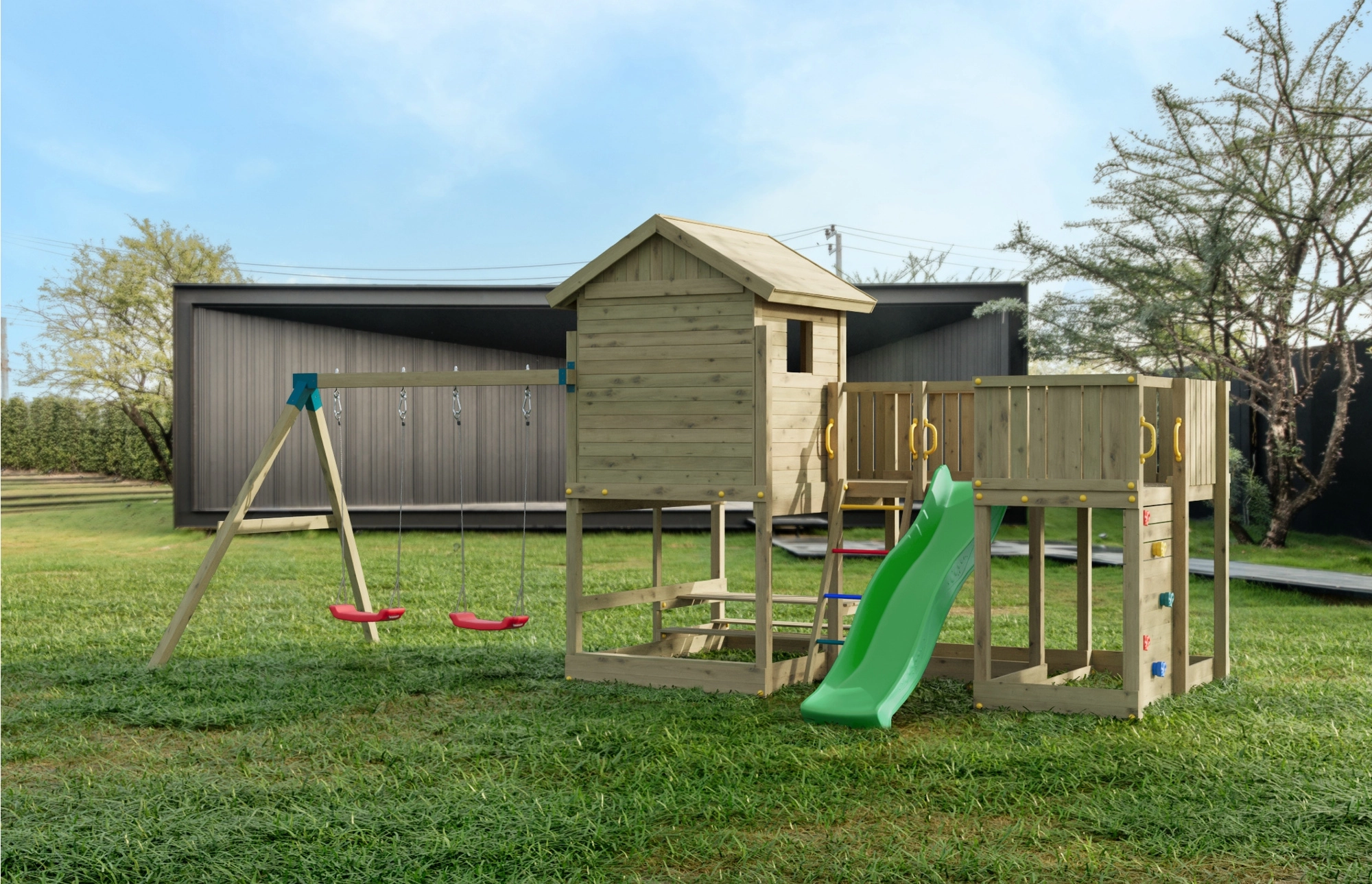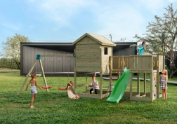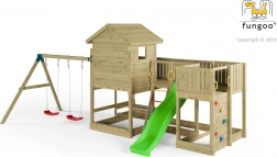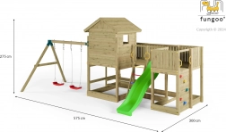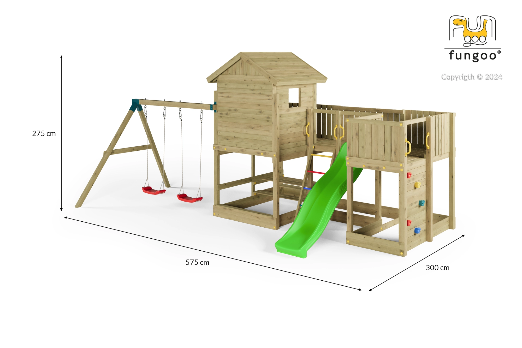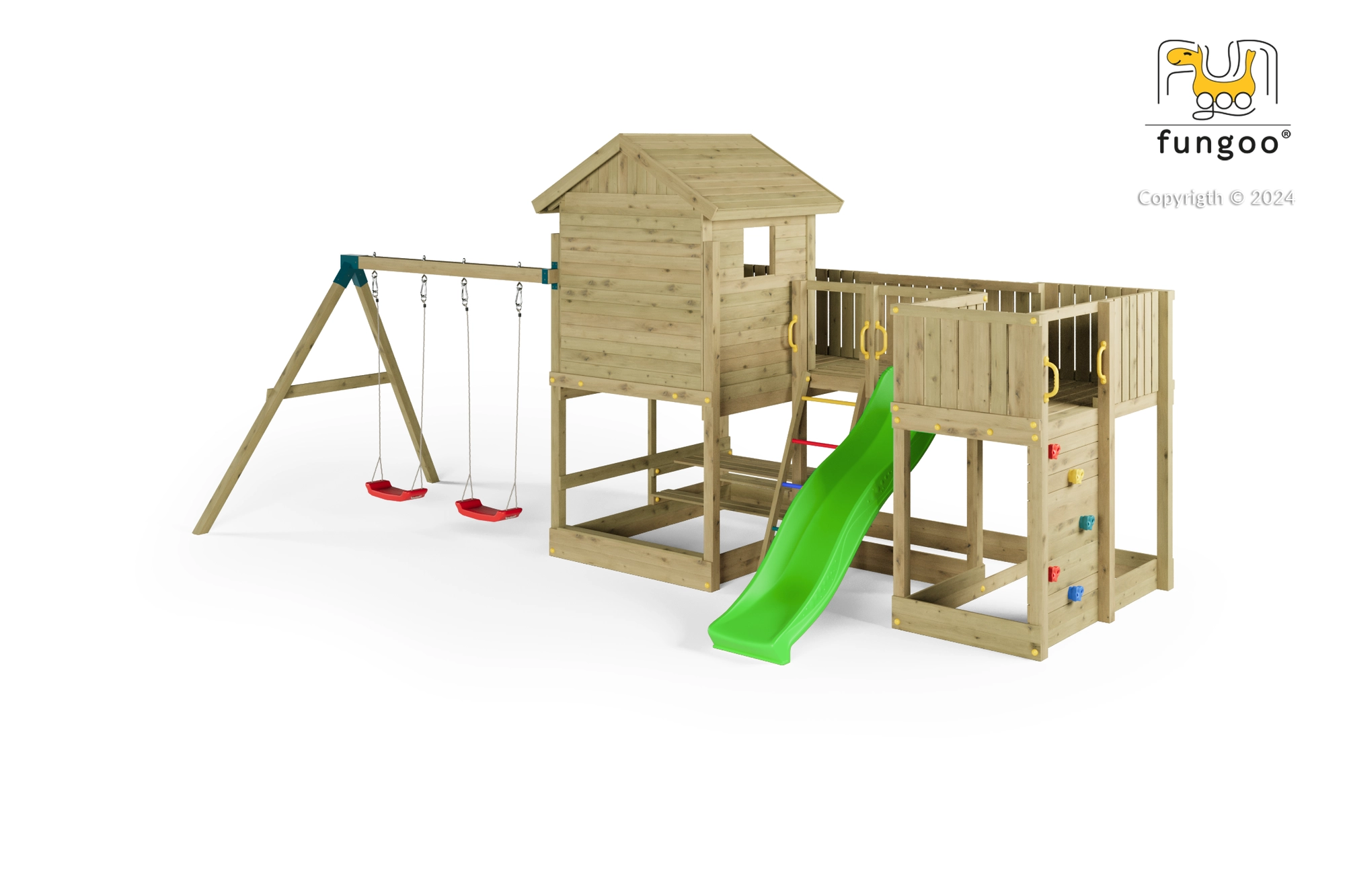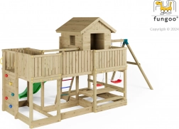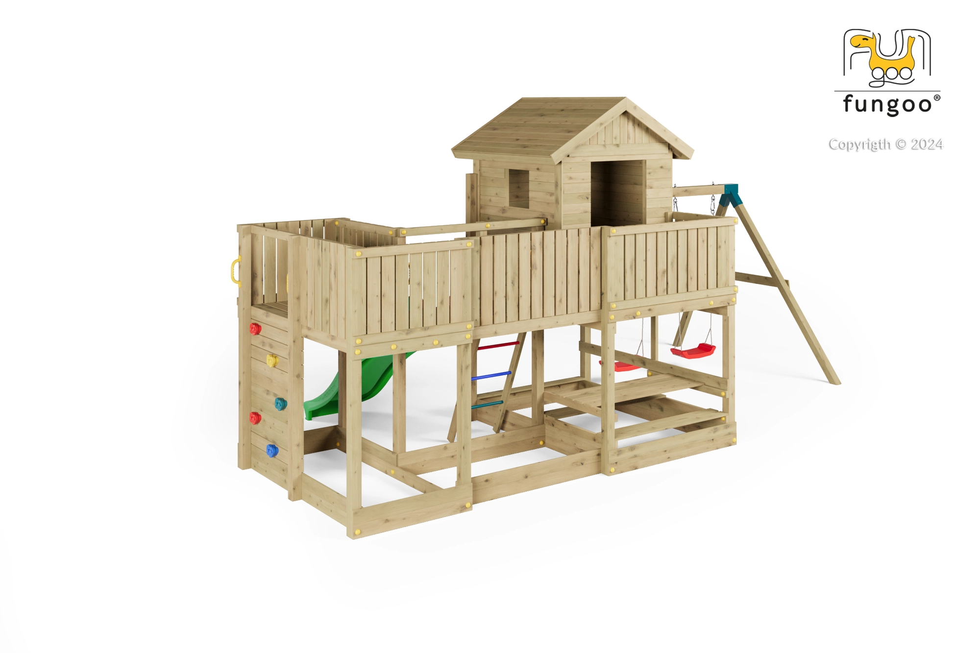 Fungoo Longstepper is een compleet tuinspeeltoestel van hoogwaardig, drukgeïmpregneerd hout, ontworpen voor een lange levensduur en dagelijks speelplezier. Dankzij de doordachte indeling van de elementen stimuleert het de motoriek, balans en fantasie van kinderen. Extra veiligheid komt van handgrepen, leuningen en stevige metalen verbindingen.