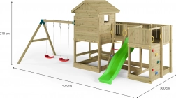 Het overdekte speelhuis met beschermende leuning stimuleert creatieve spelletjes. Kinderen bereiken het platform via de ladder met metalen sporten of via de klimwand met gekleurde grepen.
