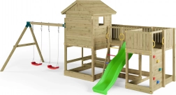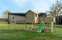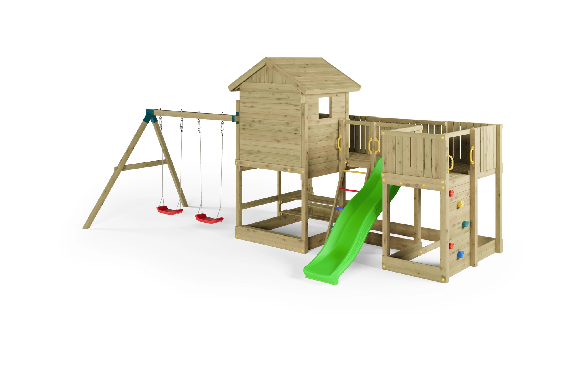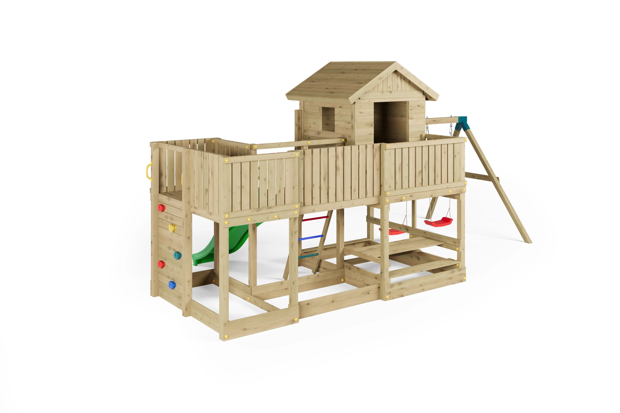 Twee verstelbare schommels, een klimwand en een zandbak met tafeltje onder het platform vermaken meerdere kinderen tegelijk en ontwikkelen zowel motoriek als verbeelding.