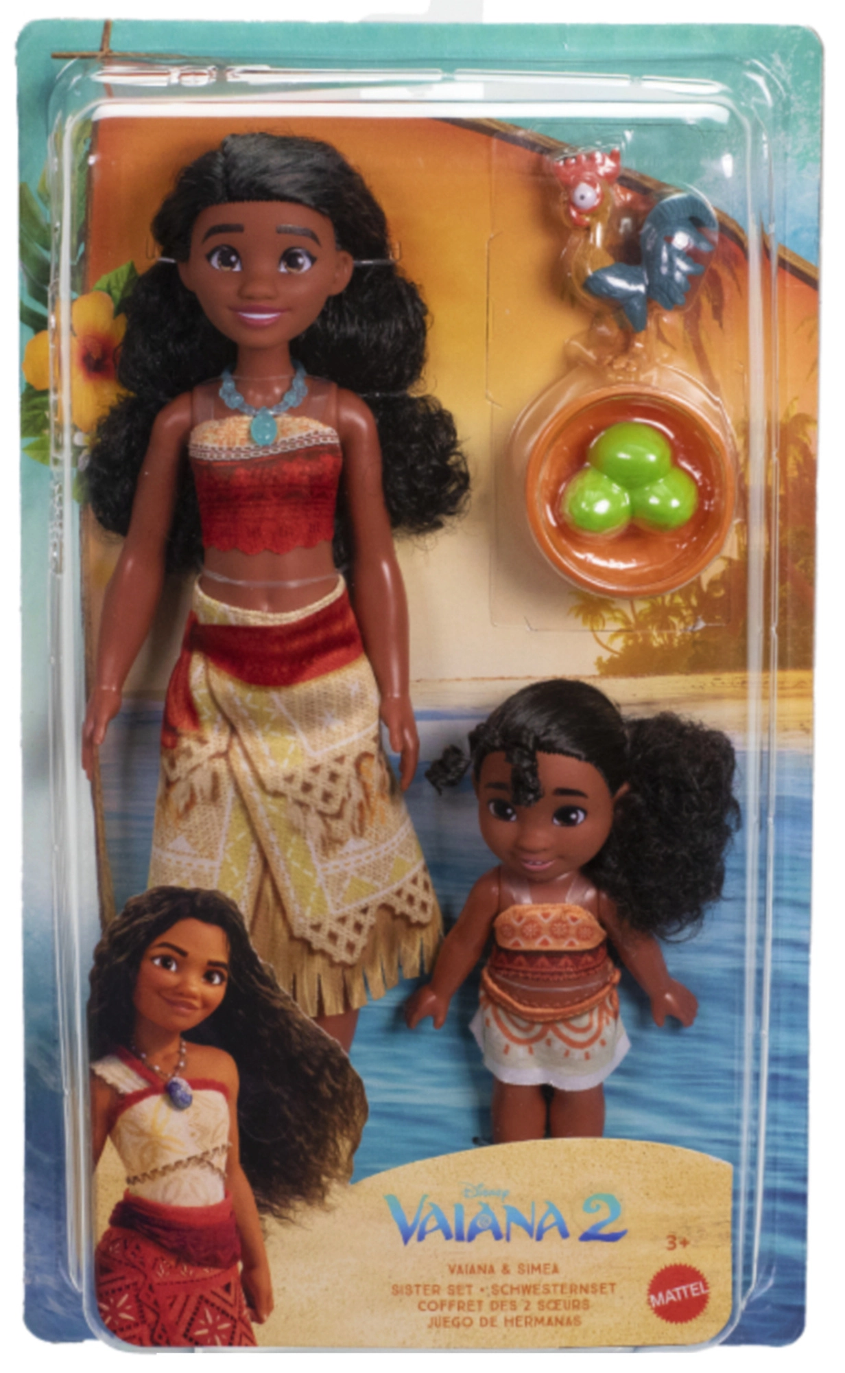 In de verpakking vind je de grote Vaiana-pop (ca. 27 cm) en de kleinere Simea-pop (ca. 11 cm) – klaar om favoriete scènes én eigen avonturen na te spelen.