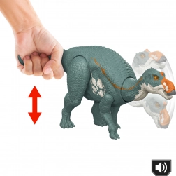 De figuur van Mattel toont de Maiasaura natuurgetrouw met realistische huidtextuur, opvallende kleuren en gedetailleerde afwerking. Dankzij de bewegende gewrichten in de poten, nek en staart stel je eenvoudig dynamische poses in, van rustige wandeling tot aanval. Het bedienen van de staart activeert een kenmerkende kaakslag en brul, wat realistische speelscènes versterkt.