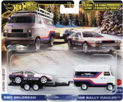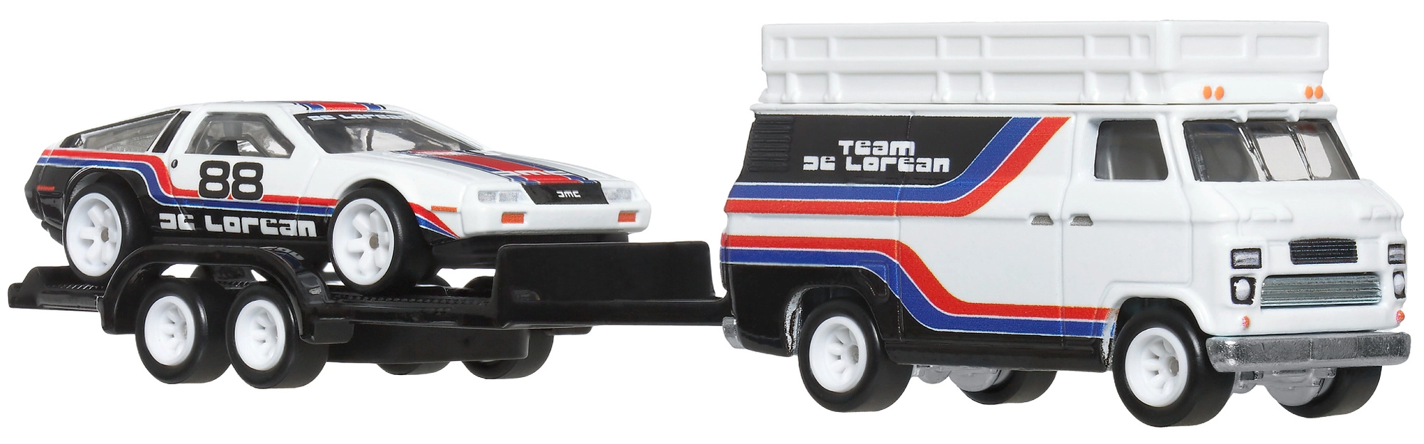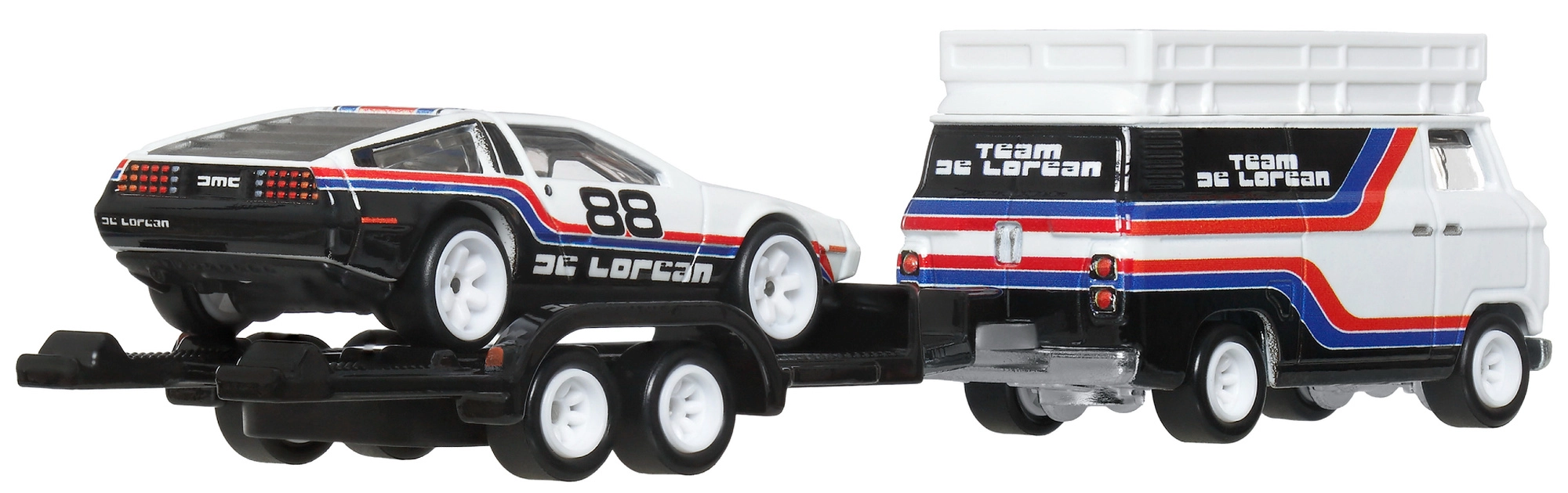 Een exclusieve set uit de Hot Wheels Premium Team Transport-lijn brengt de iconische DMC DeLorean #78 op een aanhanger achter een stijlvolle rally-hauler. Dankzij de Metal/Metal-constructie, realistische Real Riders-banden en de gedetailleerde Team DeLorean-tampondruk is dit de perfecte keuze voor verzamelaars en kinderen vanaf 3 jaar.