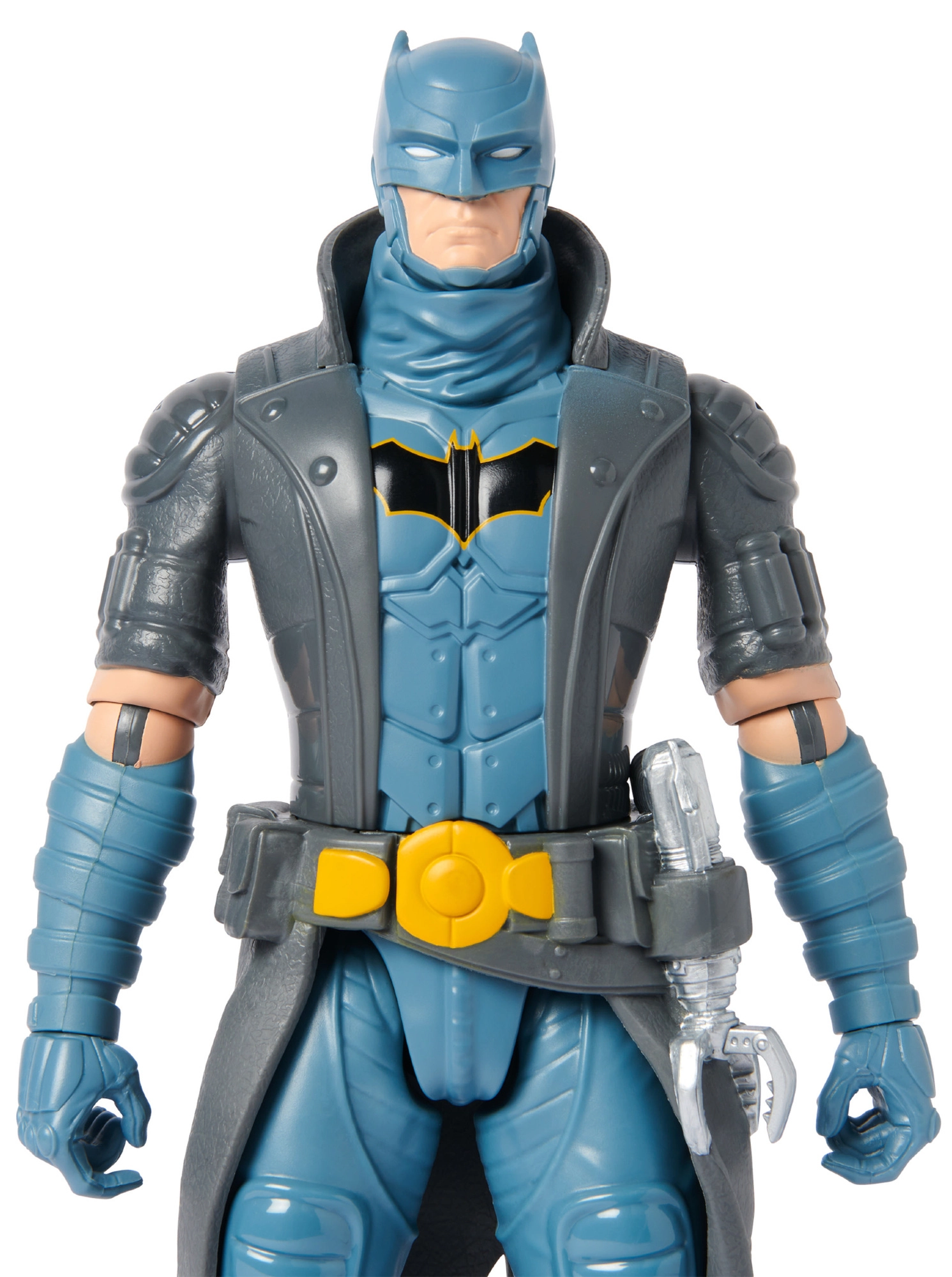 - Authentiek design: blauw-grijs pantser, gele riem, vleermuisembleem en lange cape.