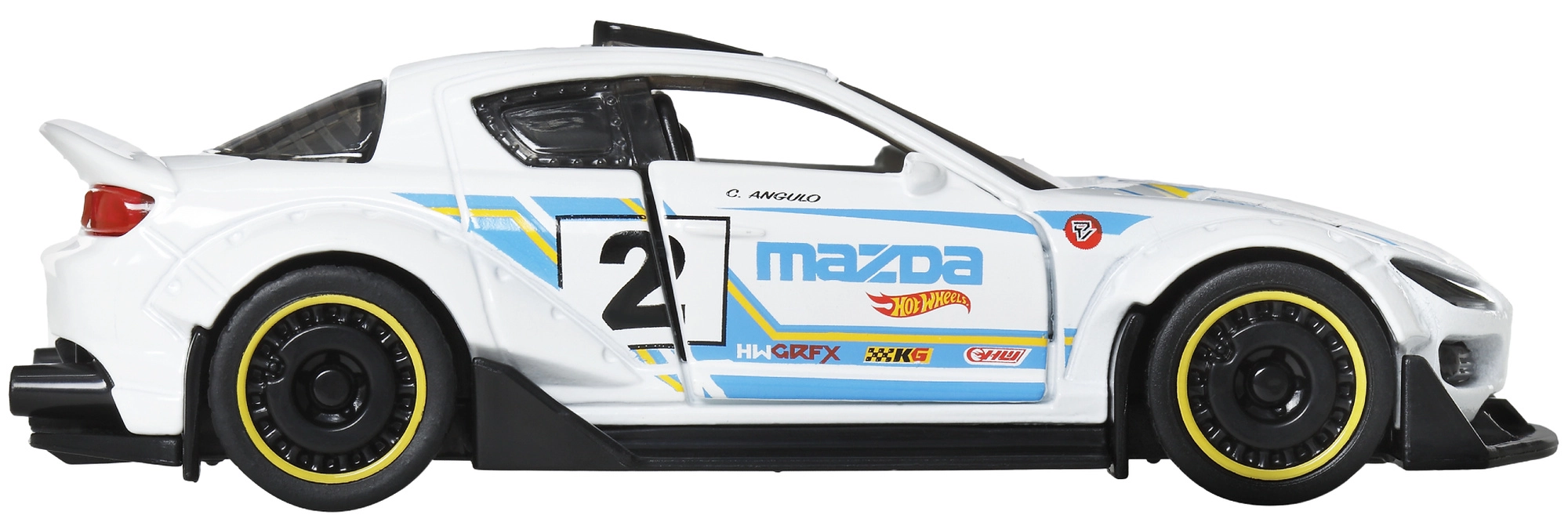 De witte carrosserie, blauwe racestrepen en aerodynamische accenten zorgen voor een realistische look voor zowel spel als collectie.