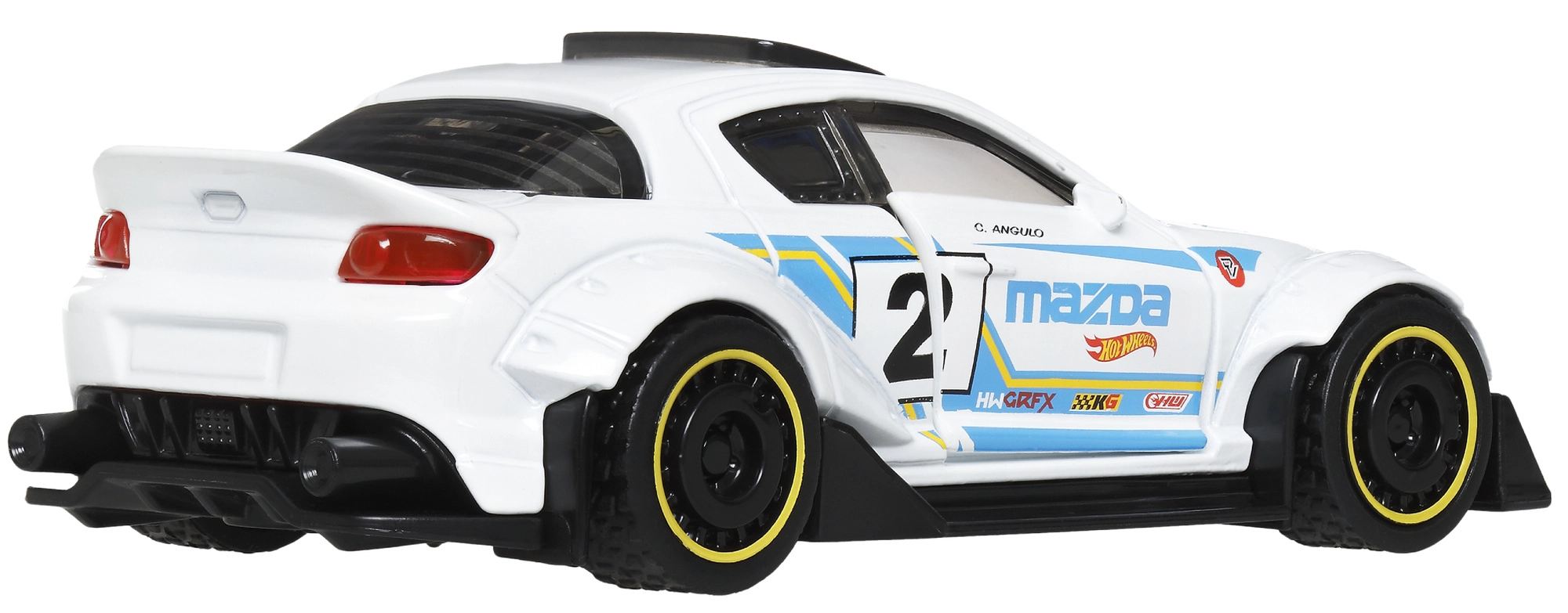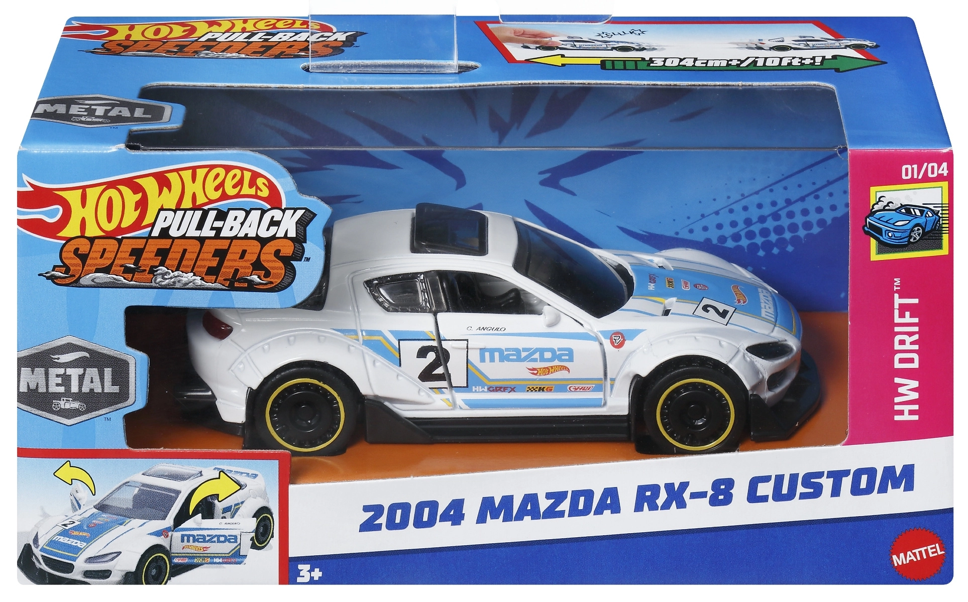 Beleef een actievolle rit met de HOT WHEELS 2004 Mazda RX-8 Custom uit de Pull-Back Speeders-serie in schaal 1:43. Dankzij de pull-back terugtrekmotor hoef je de auto alleen maar naar achteren te trekken en los te laten – hij schiet vooruit met indrukwekkende snelheid. Het model valt op door de witte carrosserie, racegraphics en gedetailleerde afwerking, heeft vrij draaiende wielen en is ideaal om mee te spelen én om te verzamelen.