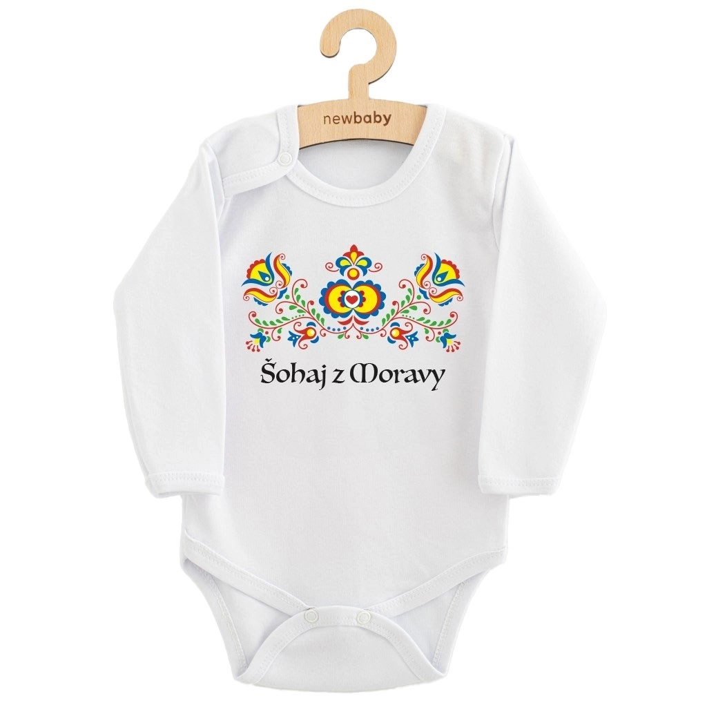 Stijlvolle babyromper met lange mouwen en folkloristisch motief „Šohaj z Moravy“ van het merk New Baby, waarin traditie en modern design samenkomen. Gemaakt van 100% katoen voor zachtheid en ademend vermogen, met gemakkelijke drukknoopsluiting op de schouder en tussen de beentjes. Gecertificeerde kleuren geschikt voor baby’s en materiaal met OEKO-TEX Standard 100 voor dagelijks comfort en veiligheid.
