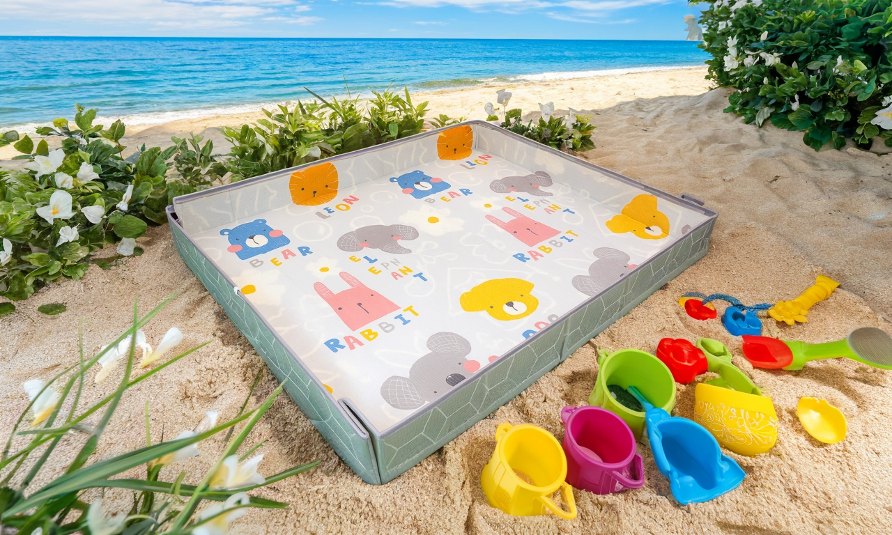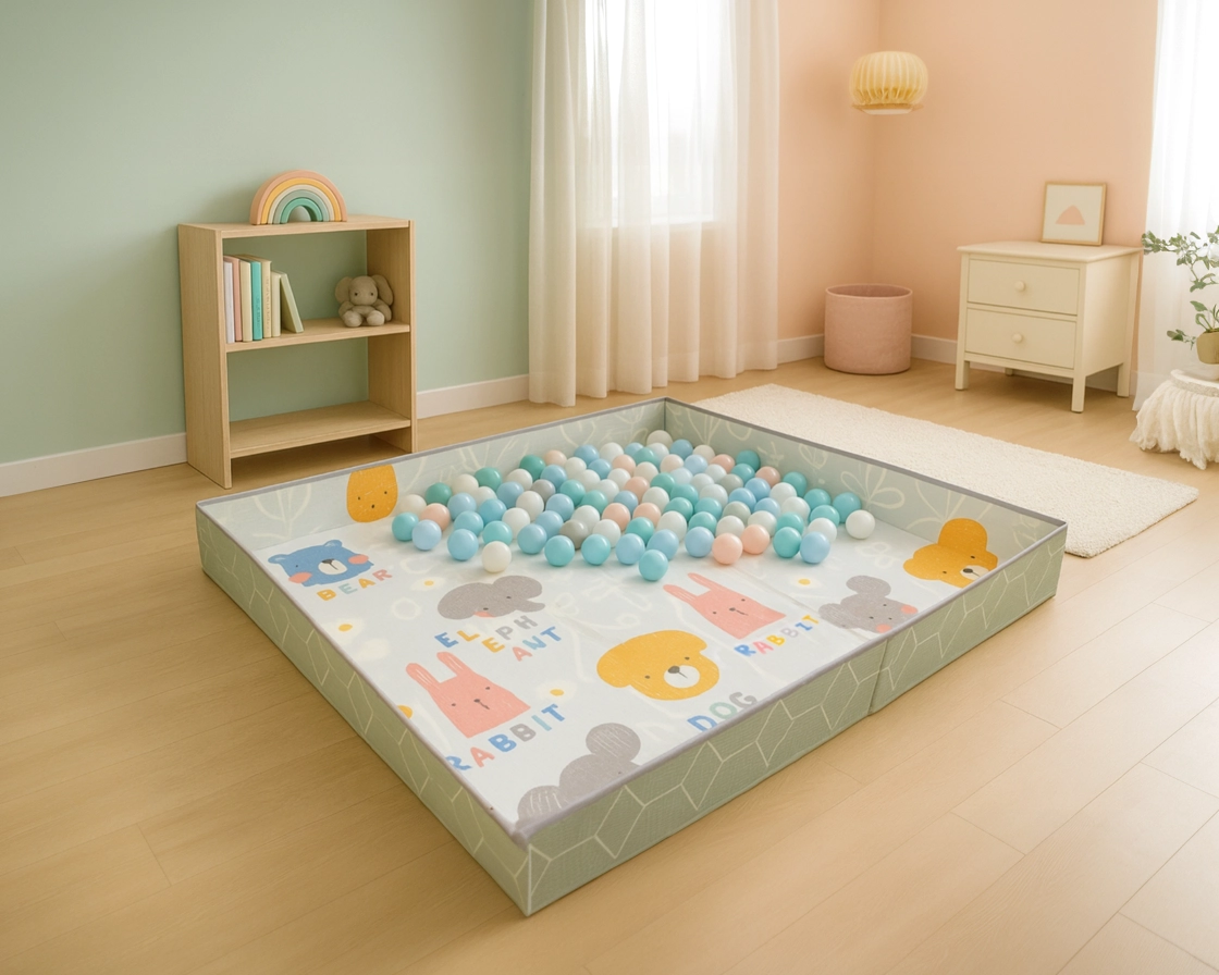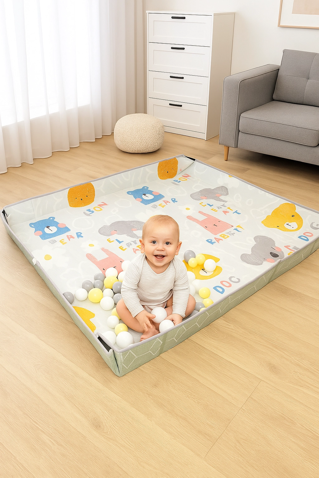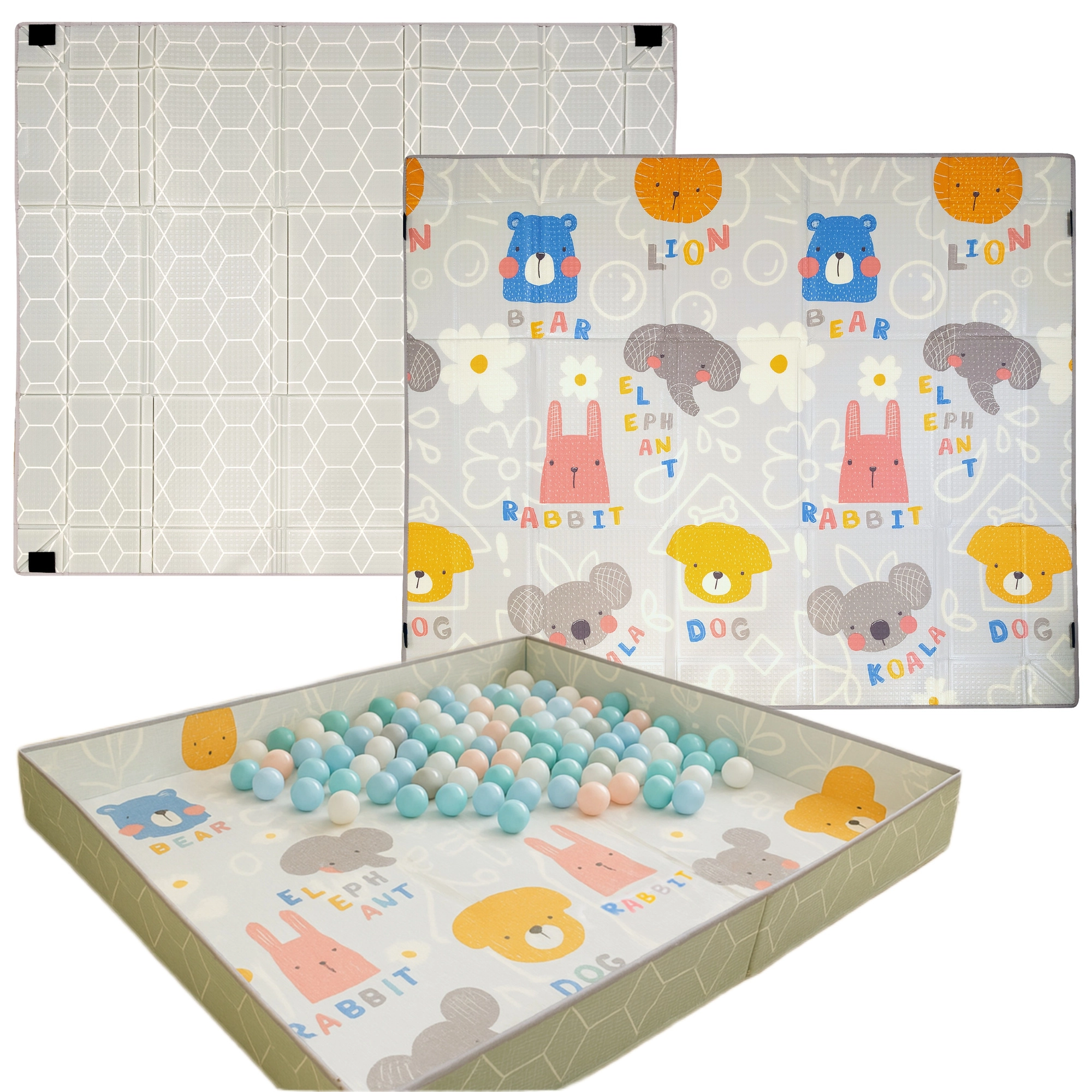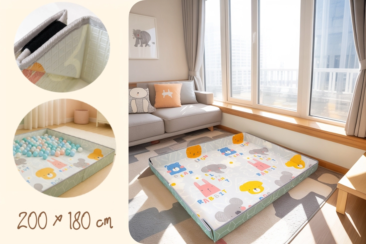 Speciale klittenbanden laten je in een handomdraai de randen optillen en een zachte speelbox of ball pit maken – voeg simpelweg ballen toe. De mat is opvouwbaar, licht en eenvoudig te reinigen (een vochtige doek volstaat). In de set vind je ook een praktische draagtAS met rits voor gemakkelijk opbergen en meenemen.