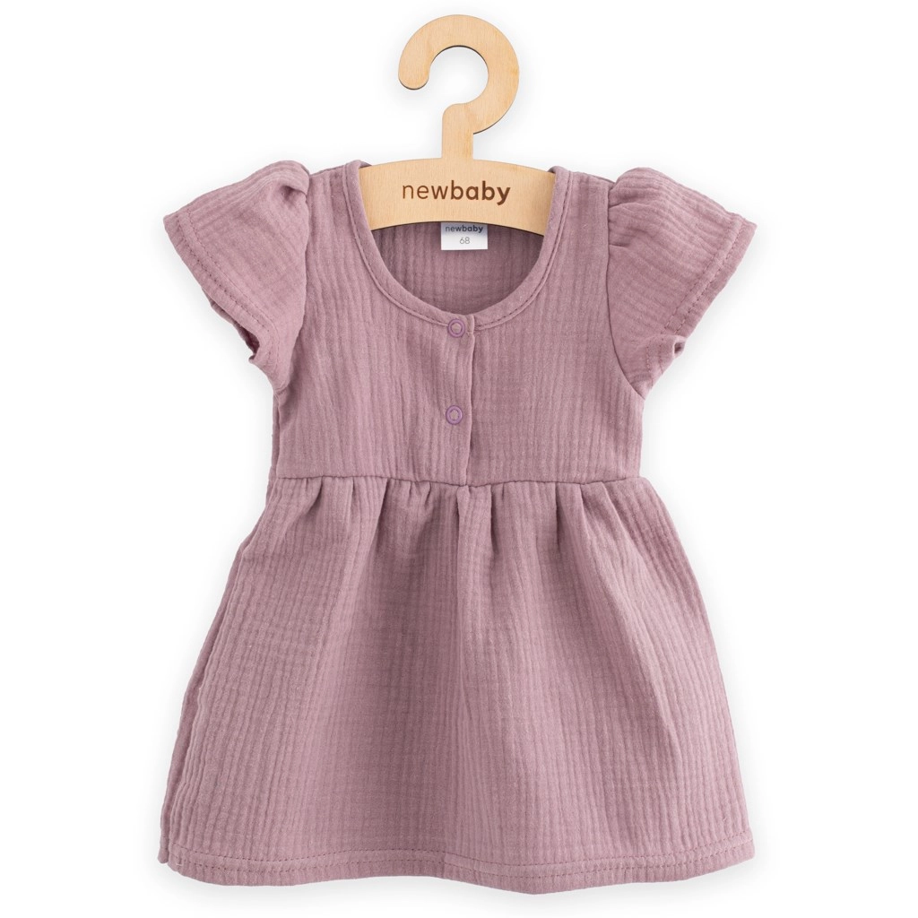 Ontdek de charme van mousseline in de kinderjurkjes van New Baby in een zachte lavendeltint. Dankzij de lichte en ademende stofstructuur zijn de jurkjes buitengewoon comfortabel, ook op warme dagen. De A-lijn snit met korte mouw en gerimpeld rokje zorgt voor bewegingsvrijheid en comfort de hele dag.