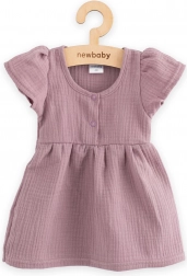 Lichtgewicht mousseline kinderjurk van New Baby in de kleur lavendel, ideaal voor de zomer. Het A-lijnmodel heeft korte mouwen en een gerimpeld rokje voor een schattige look. Sluiting aan de voorkant maakt aankleden eenvoudig. Gemaakt van hoogwaardige mousseline van 100% katoen, de jurk is zacht, ademend en comfortabel om te dragen, met het certificaat OEKO-TEX Standard 100.