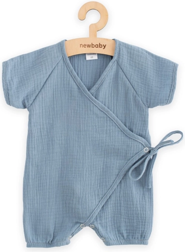Lichte en ademende zomerse romper van mousseline voor baby’s van het merk New Baby in de kleur blauw en maat 86. Dankzij de wikkelvorm kleed je hem gemakkelijk aan, met praktische drukknoopsluiting tussen de beentjes voor snel verschonen en zachte elastiekjes aan de pijpjes voor comfortabel dragen. Gemaakt van 100% katoen met OEKO-TEX STANDARD 100-certificering.