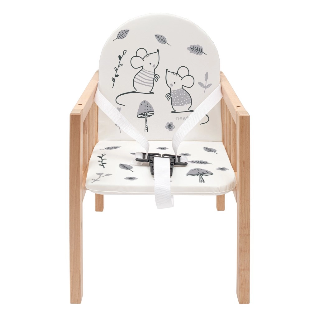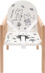 Praktische en veilige 2-in-1 kinder-eetstoel NEW BABY Jerry van stevig beukenhout. Kan worden omgevormd tot een apart tafeltje met stoeltje, heeft comfortabele bekleding met kindermotieven en een gemakkelijk afwasbaar blad. De veiligheid wordt gewaarborgd door 3-punts veiligheidsgordels en een stabiele constructie met lange levensduur. Ideaal om te voeden, spelen en tekenen.