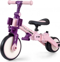 Het model OPTIMUS MAX 5-in-1 combineert meerdere gebruiksmodi: van de eerste rit met ouderlijke ondersteuning tot zelfstandig rijden op de loopfiets of driewieler met pedalen. Dankzij het stalen frame, de schuimbanden en doordachte veiligheidselementen – waaronder 3-punts veiligheidsgordels, een stuurbegrenzing en inklapbare achterwieltjes – biedt hij zekerheid en comfort in elke leercurve.