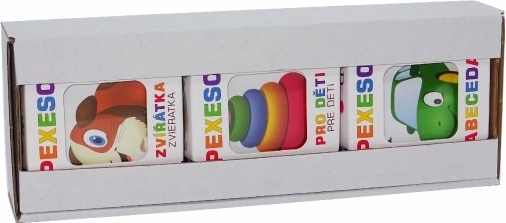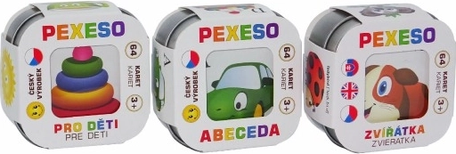 Pexeso is een van de meest geliefde kinderspelletjes die ook helpt bij de ontwikkeling van kinderen. Deze set bevat drie verschillende pexeso's in blikken doosjes, gericht op het alfabet, dieren met Engels en spellen voor kinderen.