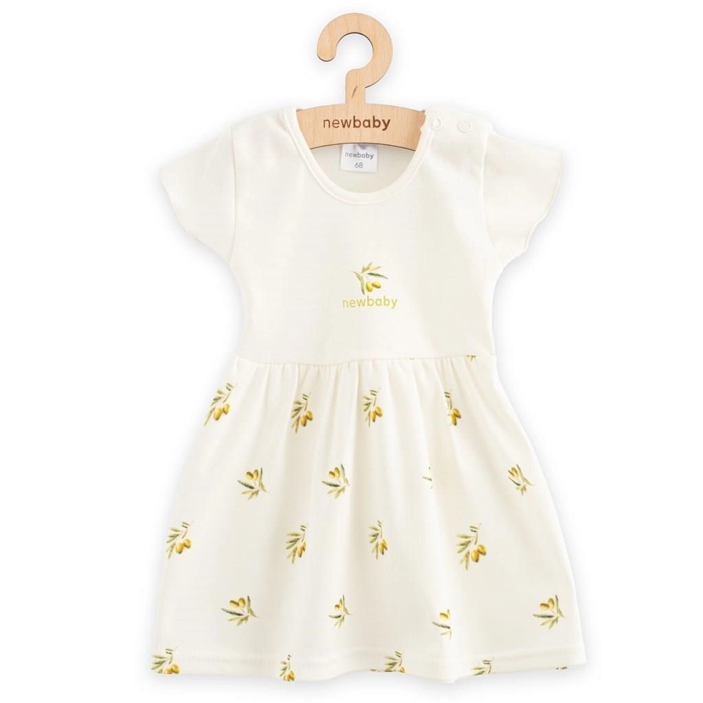 Schattige kinderjurk NEW BABY Olijven van zachte, 100% biologische katoen is licht, prettig om te dragen en versierd met een subtiele olijvenprint. Voor gemakkelijk aankleden heeft hij een drukknoopsluiting en voldoet hij aan de strenge certificering OEKO-TEX STANDARD 100.