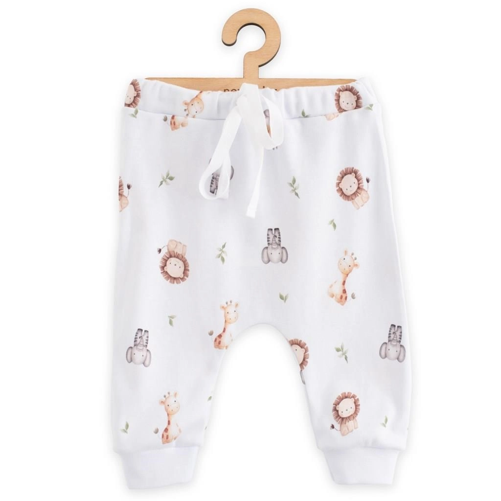 Comfortabele baby joggerbroek van puur katoen met een speels safarimotief, ideaal voor elke dag. Voorzien van een zachte tailleband met elastiek, een decoratief koord en bredere boorden aan de pijpen voor maximaal comfort. Gemaakt van 100% katoen met OEKO-TEX STANDARD 100 certificaat voor veilig contact met de babyhuid.