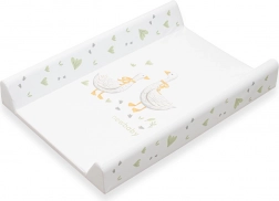 Praktische en veilige aankleegplatform New Baby met gansjes in pasteltinten biedt elke dag comfortabel en hygiënisch verschonen. Het heeft een waterdicht oppervlak, gevormde verhoogde zijkanten voor extra veiligheid en een stevige bodemplaat voor stabiele bevestiging op een ledikant of standaard. Gemaakt van gecertificeerde folie zonder schadelijke stoffen, vriendelijk voor de babyhuid.