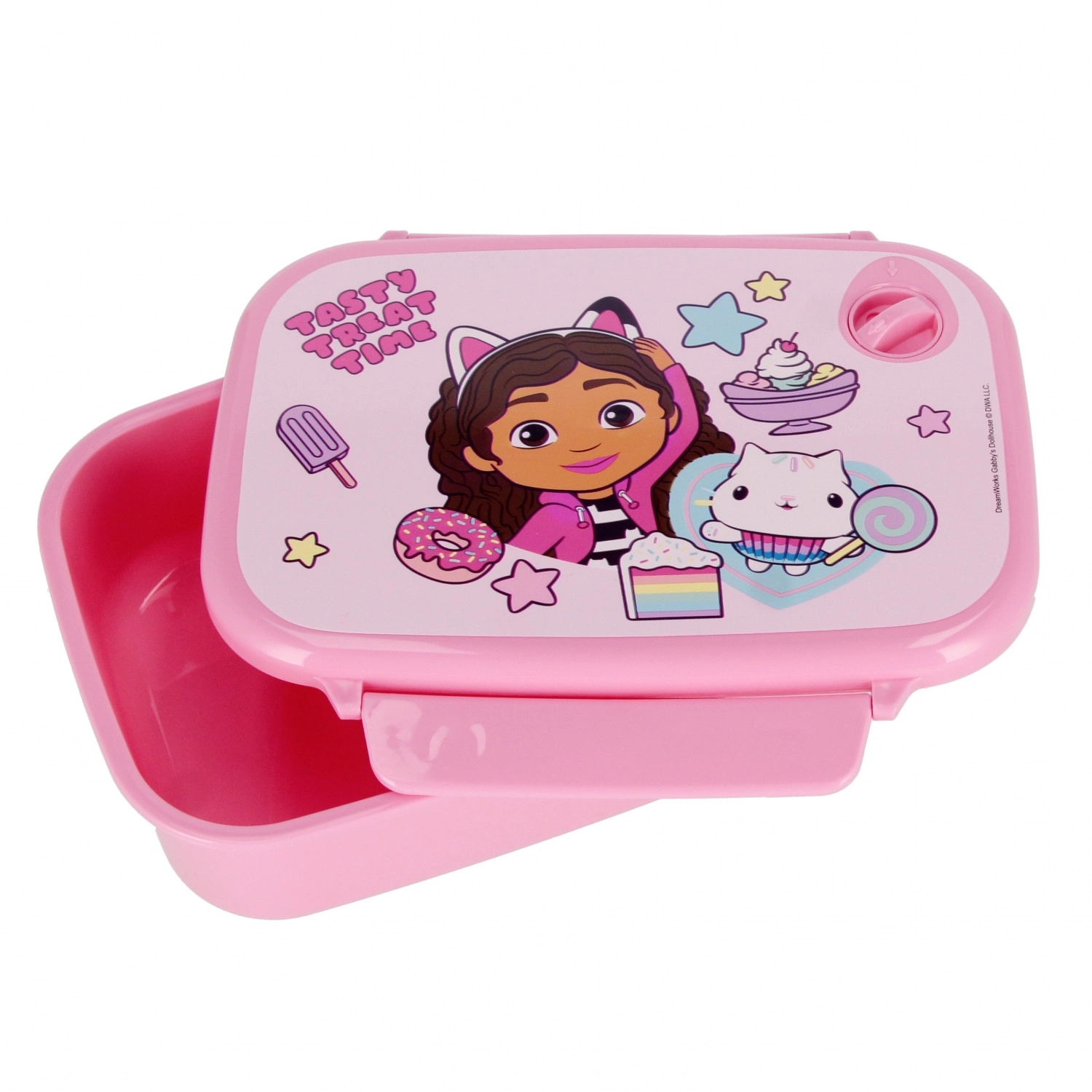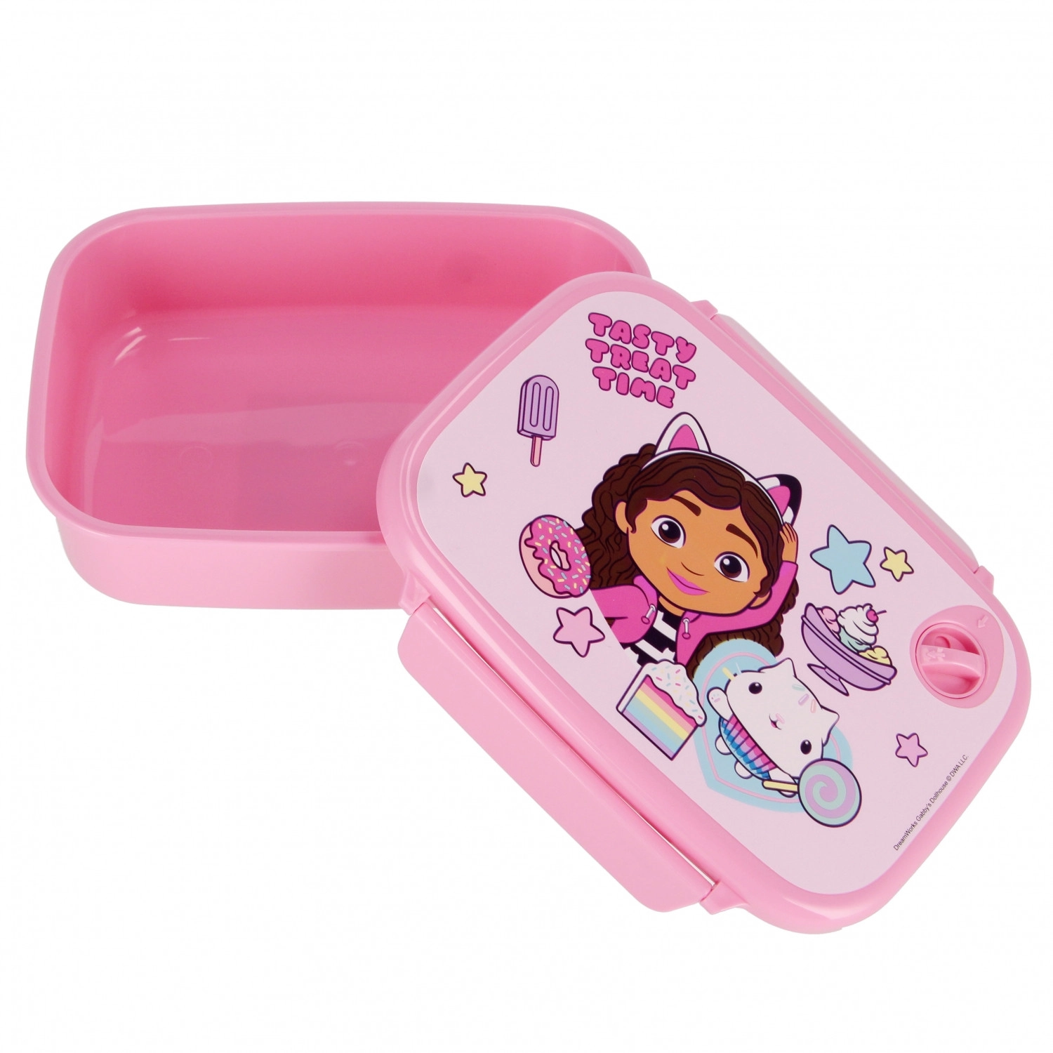 Stijlvolle roze snackbox voor kleine fans van GABBY'S DOLLHOUSE met genoeg ruimte voor een broodje, fruit en kleine lekkernijen. De gladde, afgeronde randen liggen fijn in de hand en het stevige kunststof is eenvoudig hygiënisch te houden.