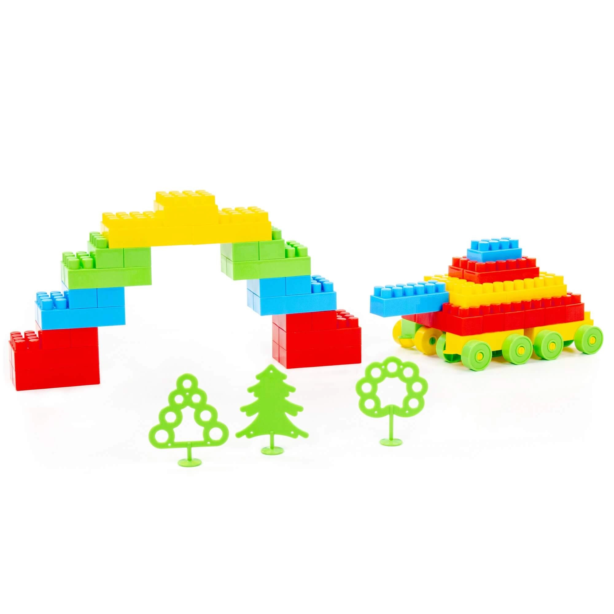 Dankzij speciale onderdelen met wielen maken kinderen eenvoudig een rijdende vrachtwagen met aanhanger en versieren ze de scène met groene boompjes. Ideaal voor creatief transportspel.