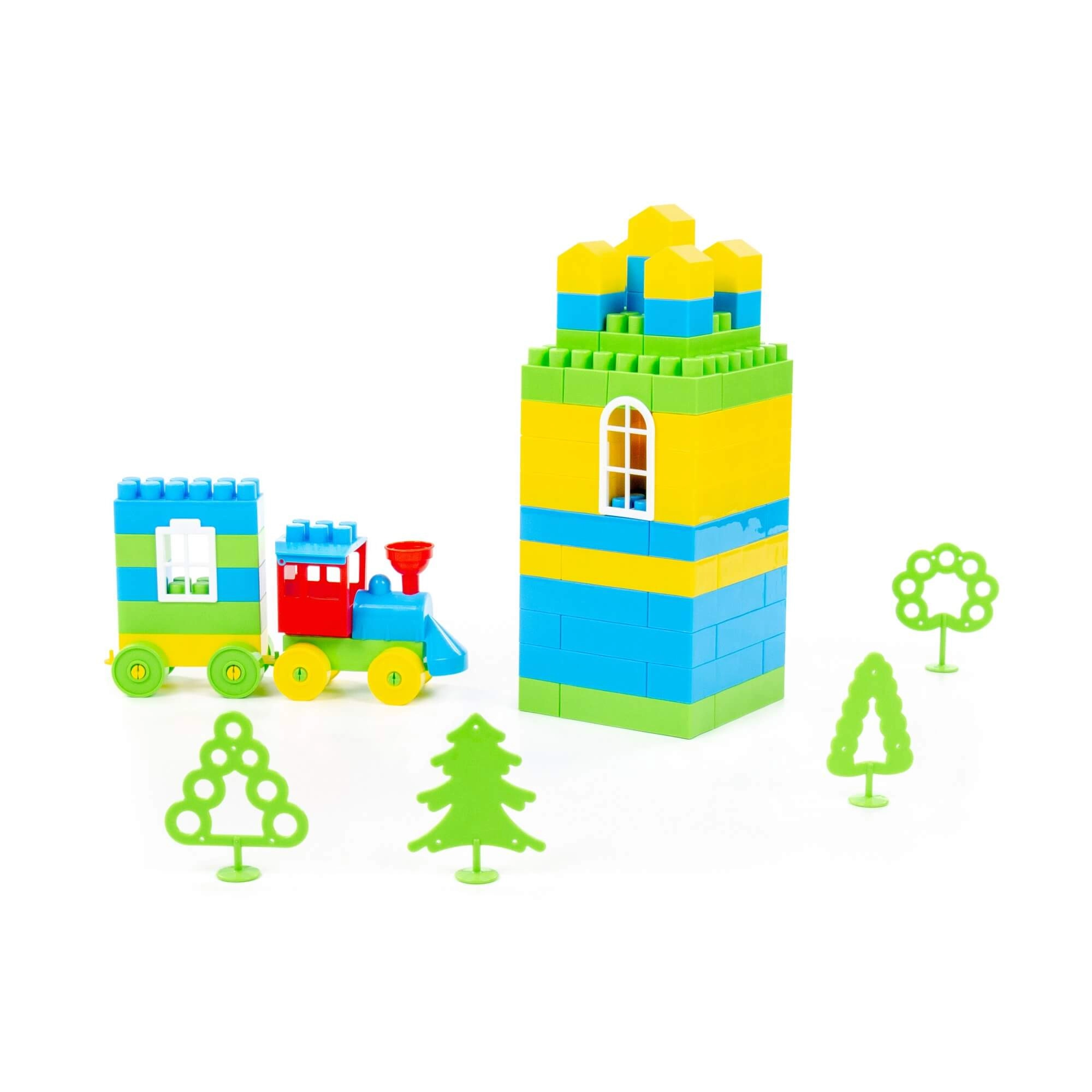 Bouw een imposante toren en een klein treintje met wagon. Groene accessoires helpen bij het creëren van eigen verhalen en omgevingen.