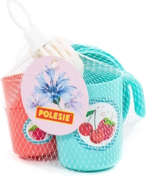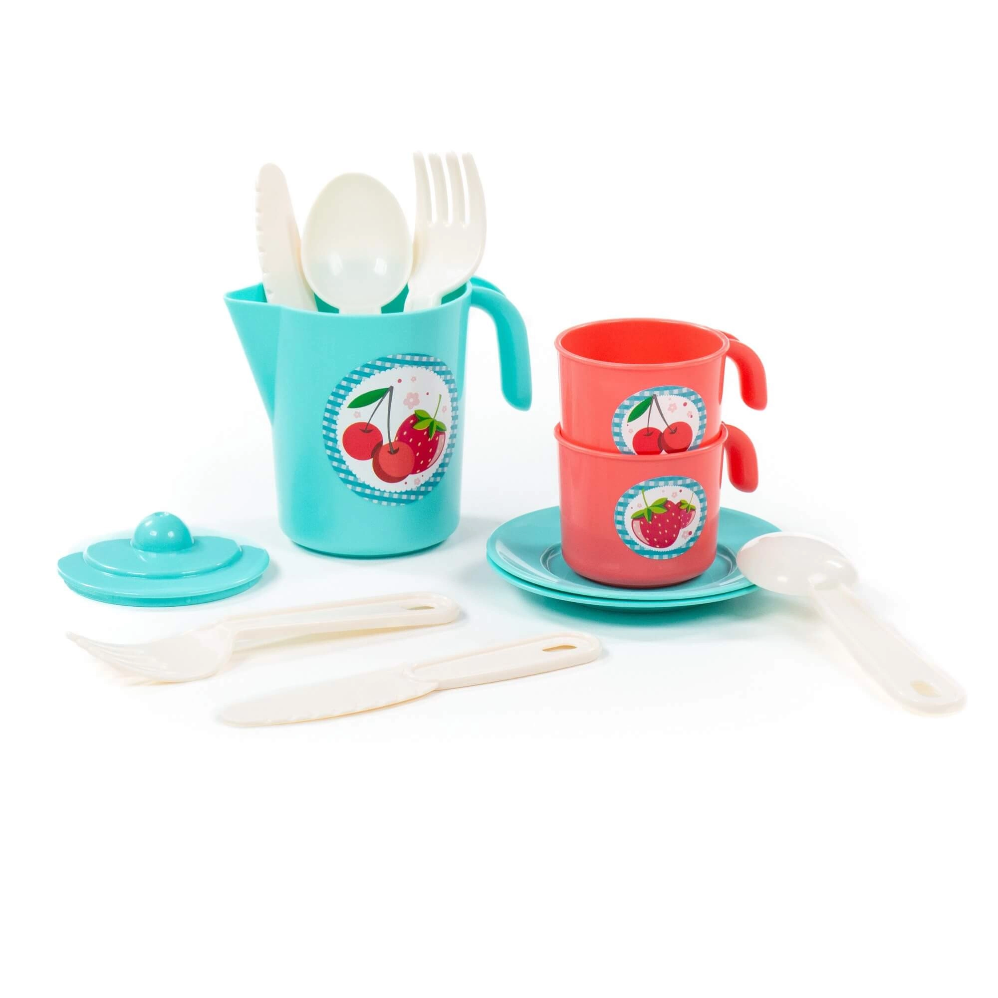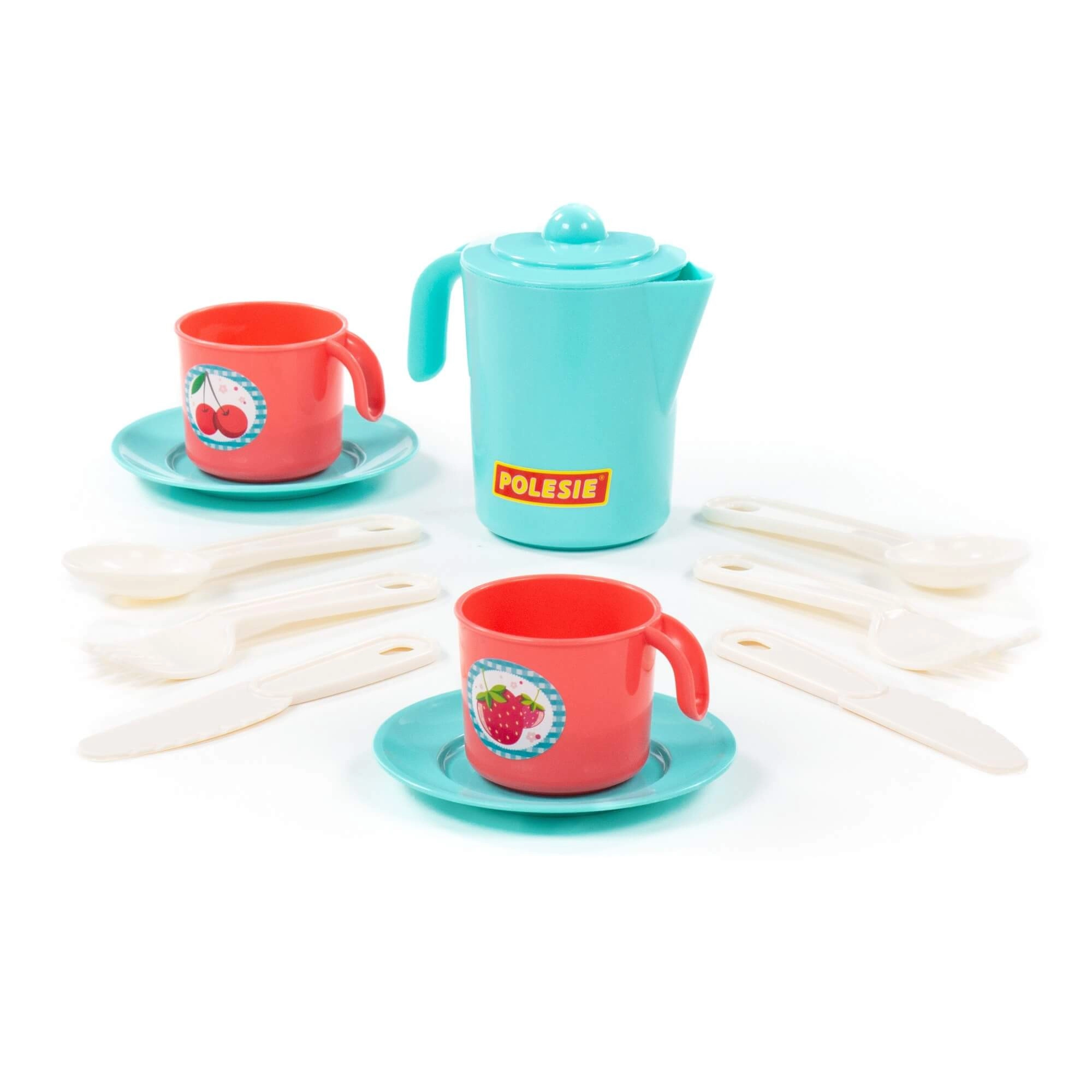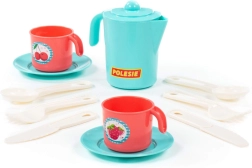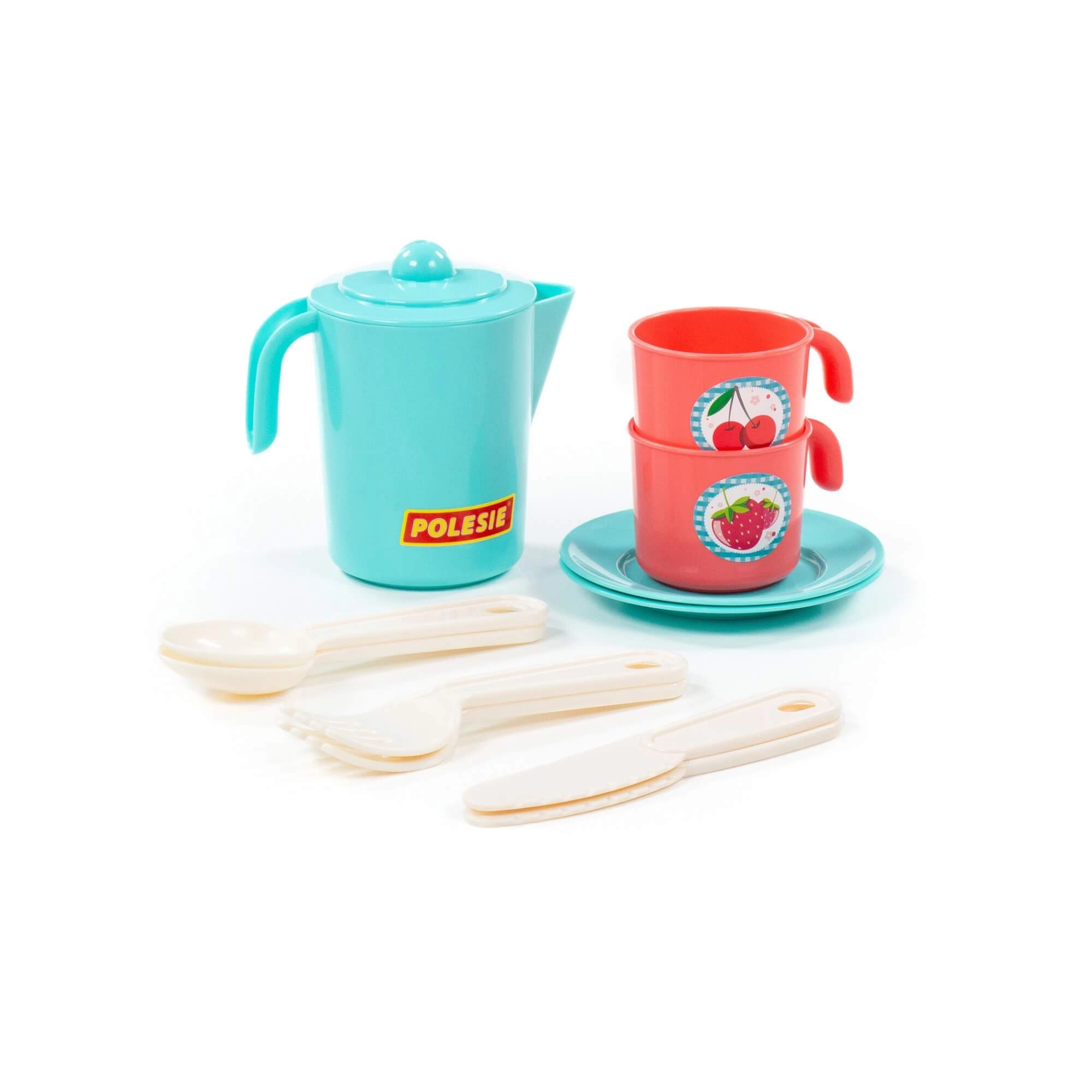 De set bevat een theepotje met deksel, 2 kopjes met oortjes, bordjes/schoteltjes en kunststof bestek. Dankzij de veilige, gladde randen en het lage gewicht is het servies gemakkelijk hanteerbaar. Compacte afmetingen ca. 130 × 105 × 121 mm maken opbergen en meenemen eenvoudig.