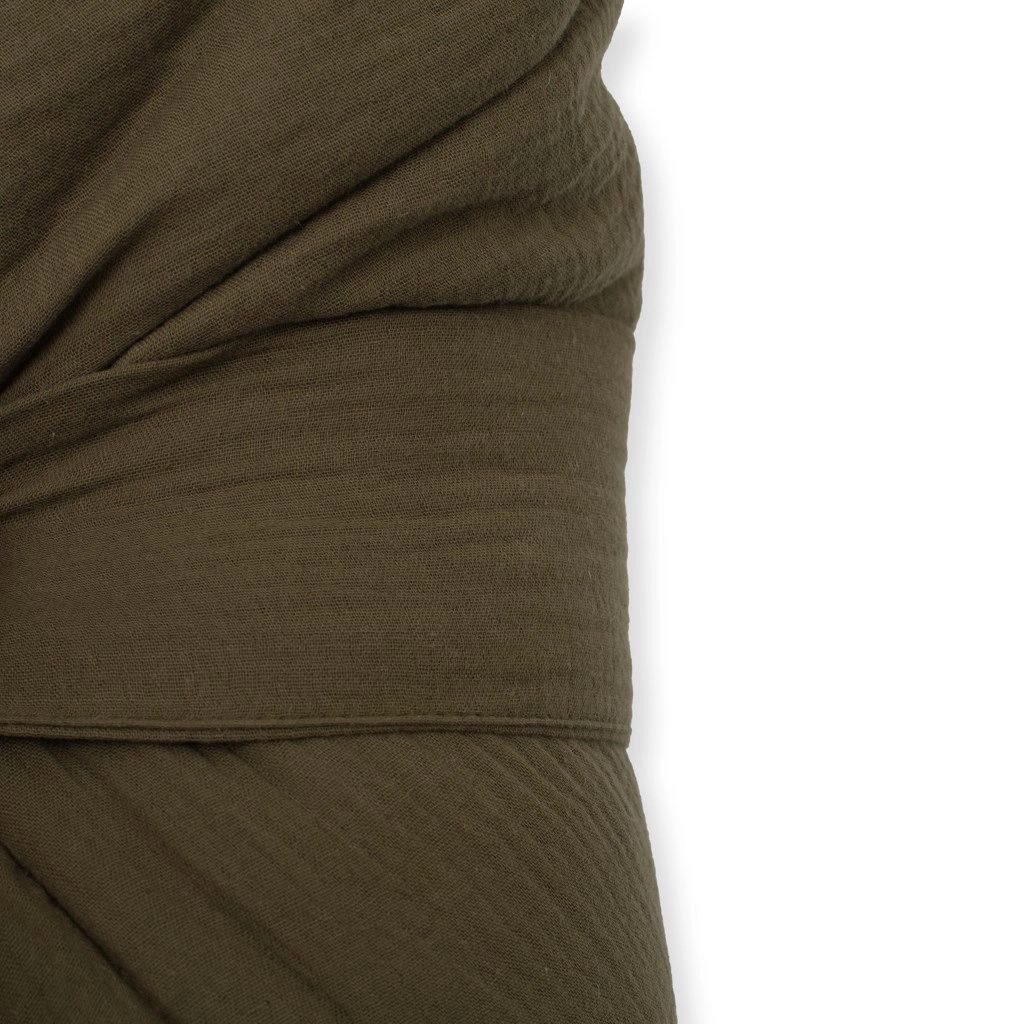 De brede geweven strik maakt eenvoudig aansnoeren naar behoefte mogelijk en houdt de inwikkeldoek stevig en comfortabel op zijn plaats.