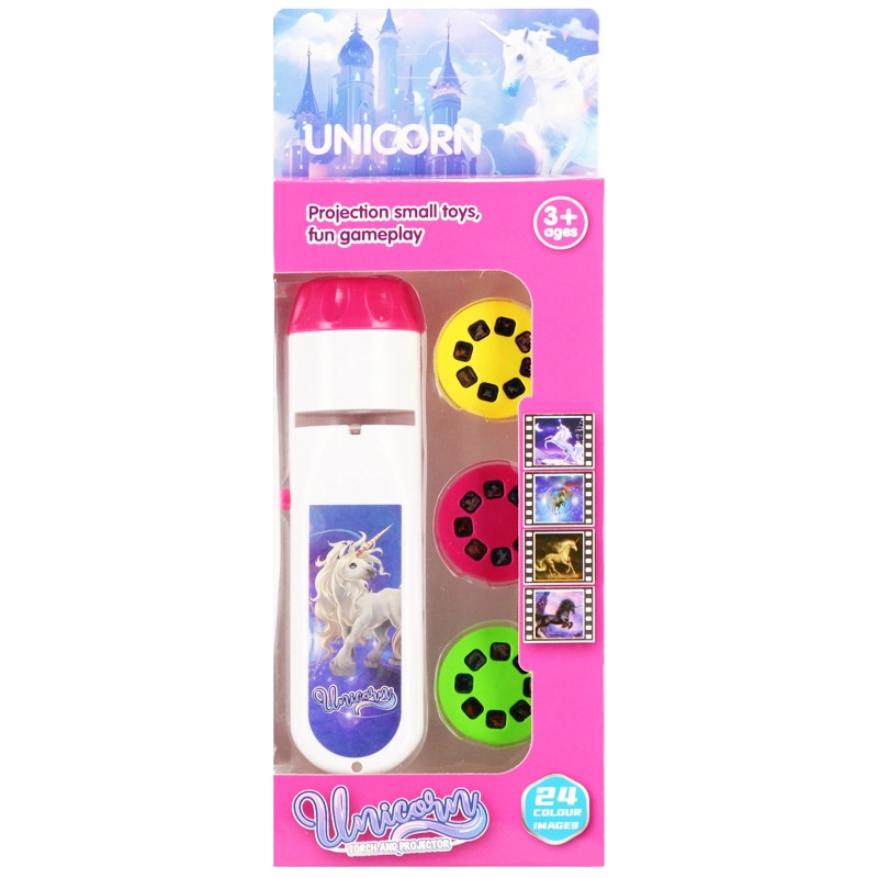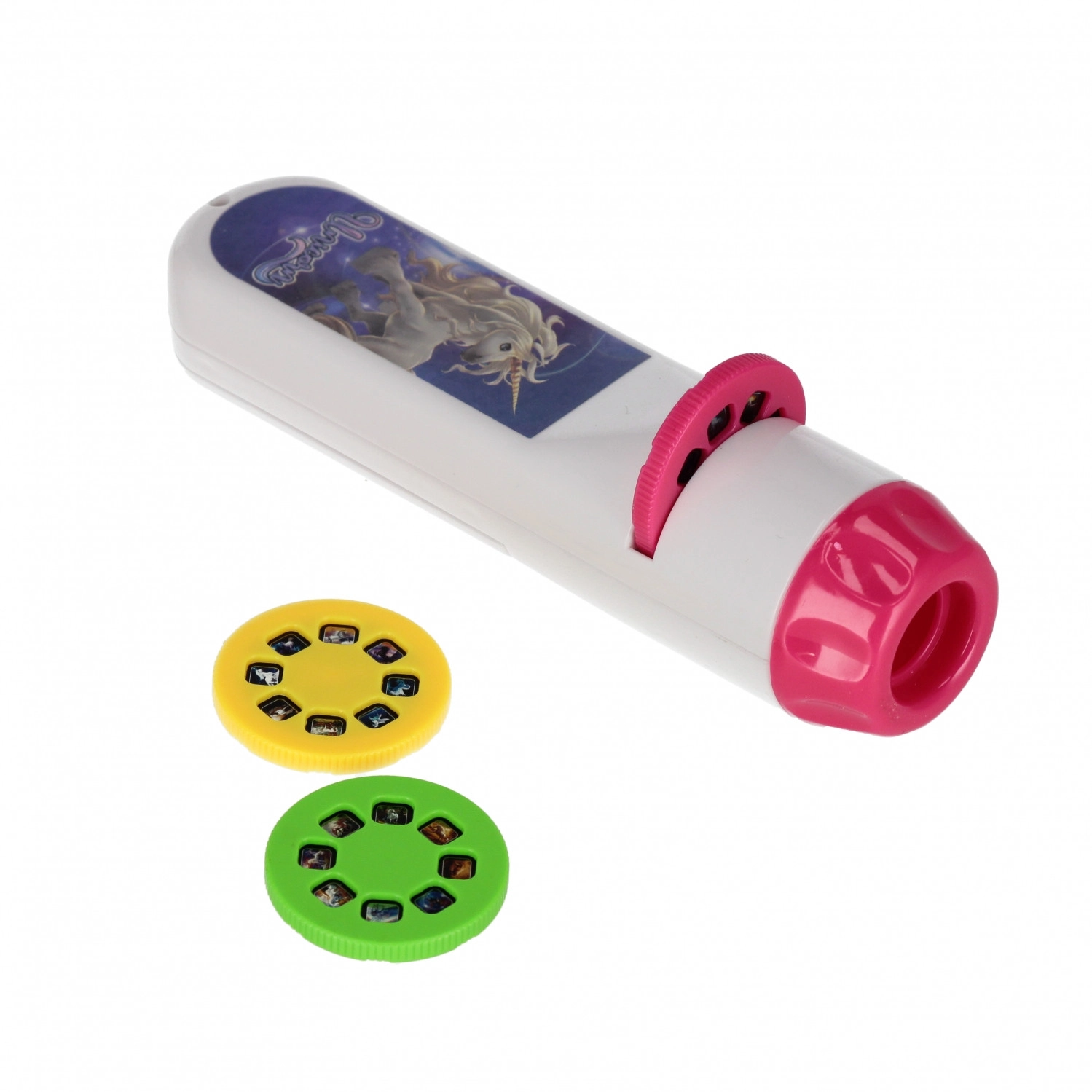 Een leuke projector met een eenhoornthema die elke kleine kunstenaar zal verrassen. Met behulp van verwisselbare schijven projecteer je eenvoudig motieven op papier, wat het tekenen makkelijker maakt. De set bevat een projector en 3 schijven met afbeeldingen. De compacte afmetingen 4 × 14 × 4 cm zijn ideaal voor onderweg. Geschikt voor kinderen van 3+. Vereist 2× AA (LR06) batterijen – niet inbegrepen.
