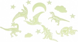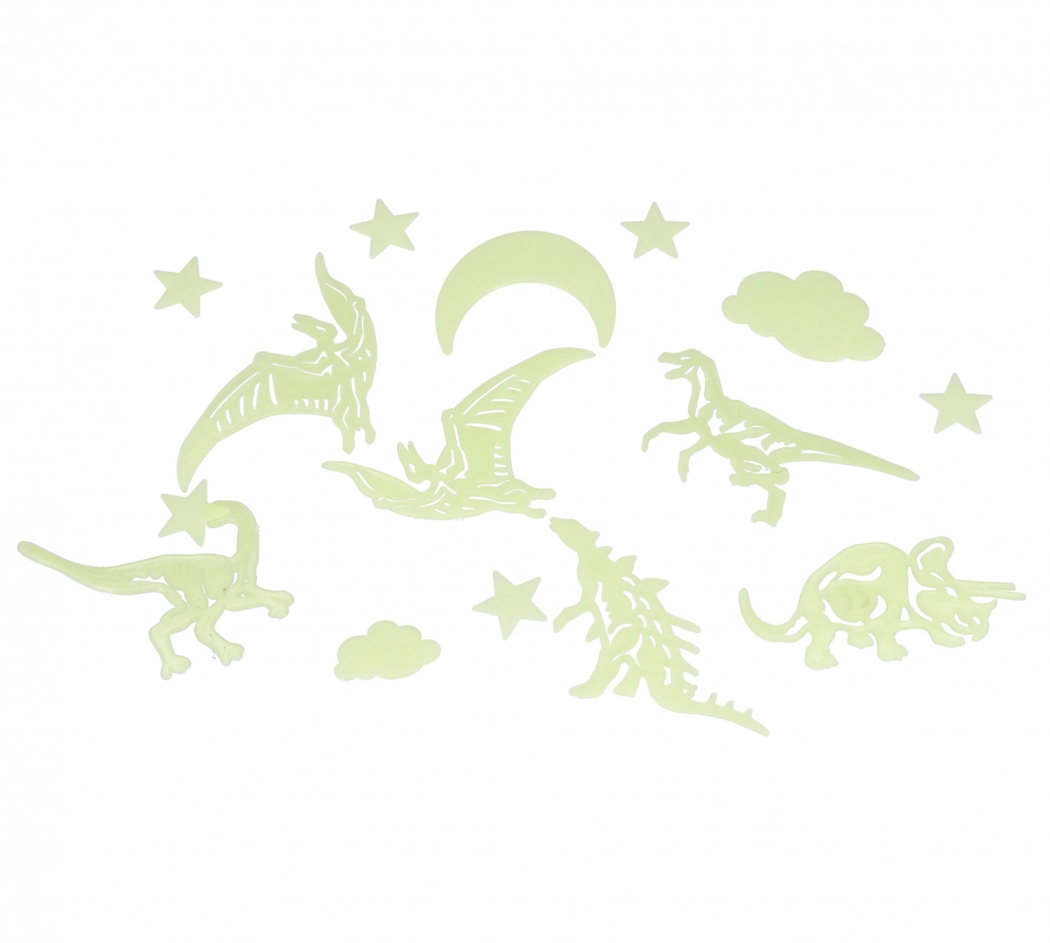 Verander de kinderkamer in een magische dinowereld. De lichtgevende stickers hechten gemakkelijk op gladde oppervlakken en geven een aangename gloed in het donker nadat ze aan licht zijn blootgesteld. Ideaal als decoratie boven het bed, bij het bureau of op de deur.