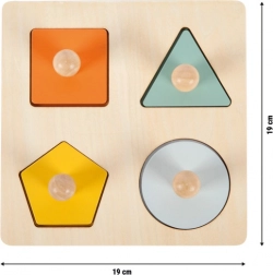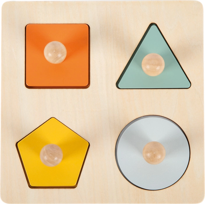 Deze robuuste inlegpuzzel is ontworpen voor kleine kinderhandjes. Elk van de vier kleurrijke stukken heeft een praktisch houten knopje, zodat ze prettig vast te houden en in de juiste openingen te plaatsen zijn. Onder de vormen ontdekken kinderen lieve illustraties van een tijger, krokodil en luipaard en ook een veilig spiegeltje, wat nieuwsgierigheid en speelse interactie bevordert.