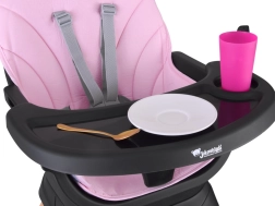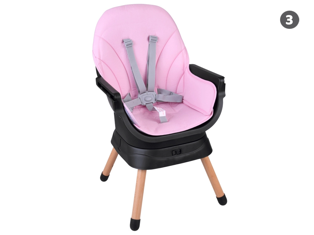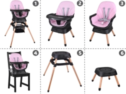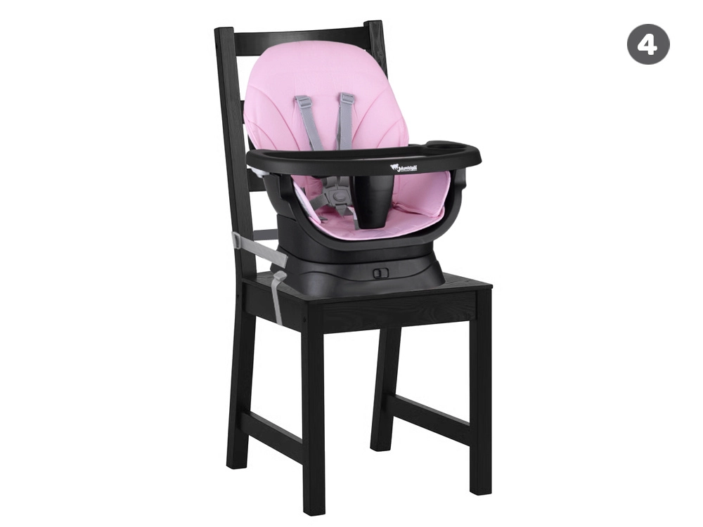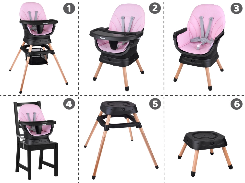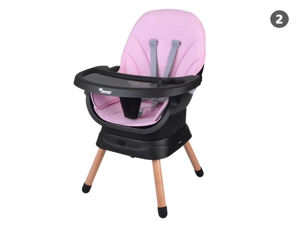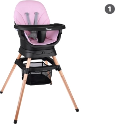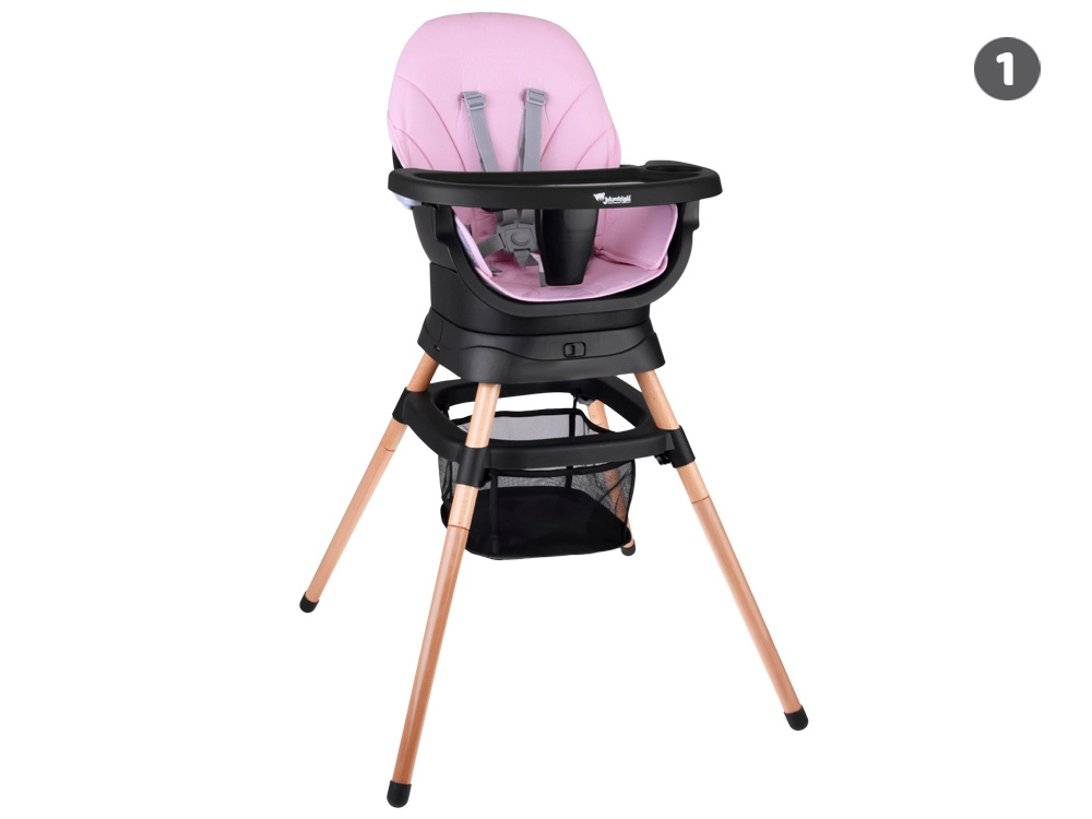 Het modulaire systeem maakt snelle ombouw zonder gereedschap mogelijk: hoge kinderstoel, lage stoel met blad, losse fauteuil, opzet voor een eetkamerstoel met bevestigingsriemen, hoge kruk en lage kruk. De ruimte onder de stoel wordt aangevuld met een praktische mand voor kleine spulletjes.