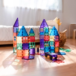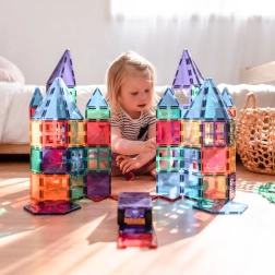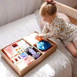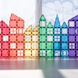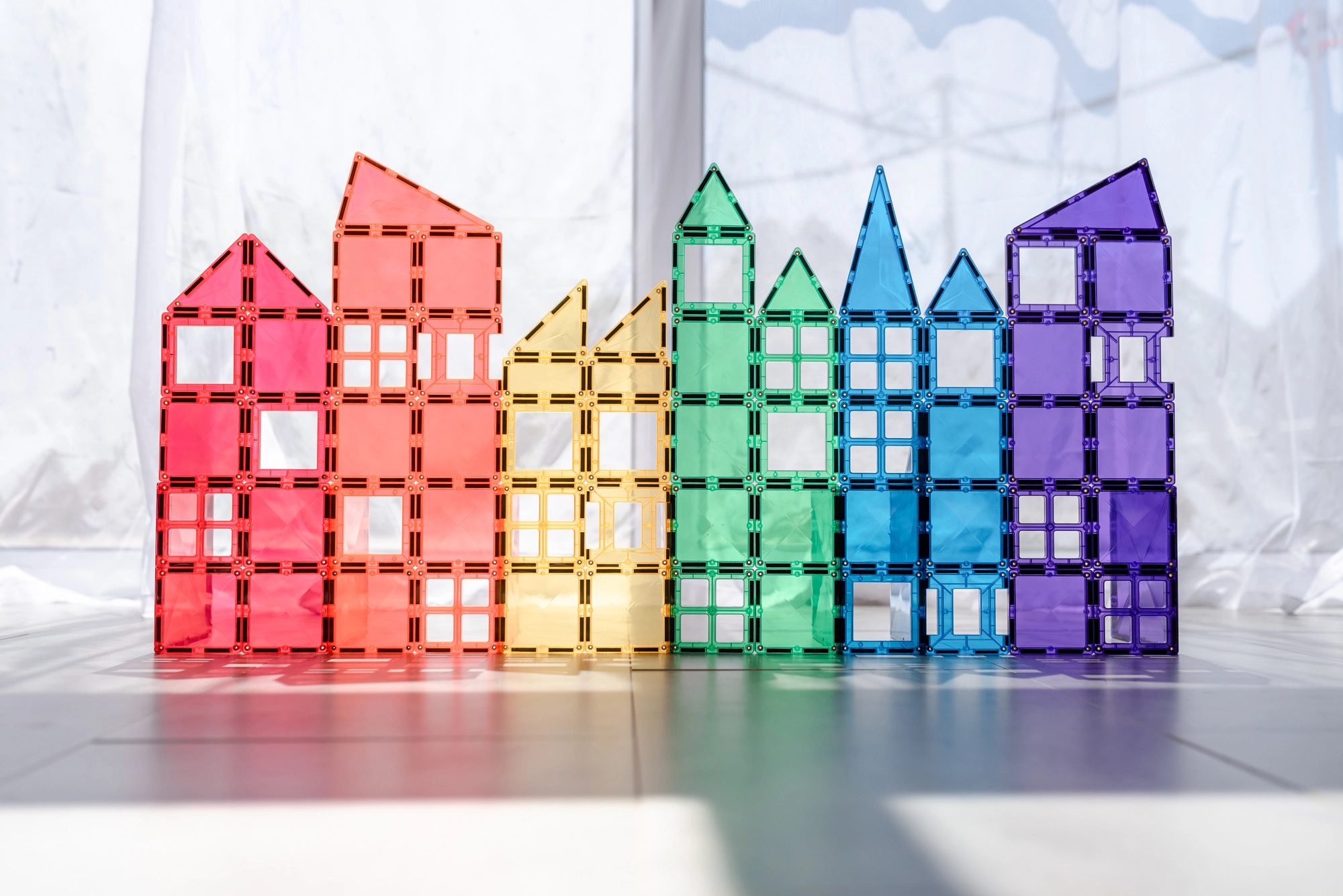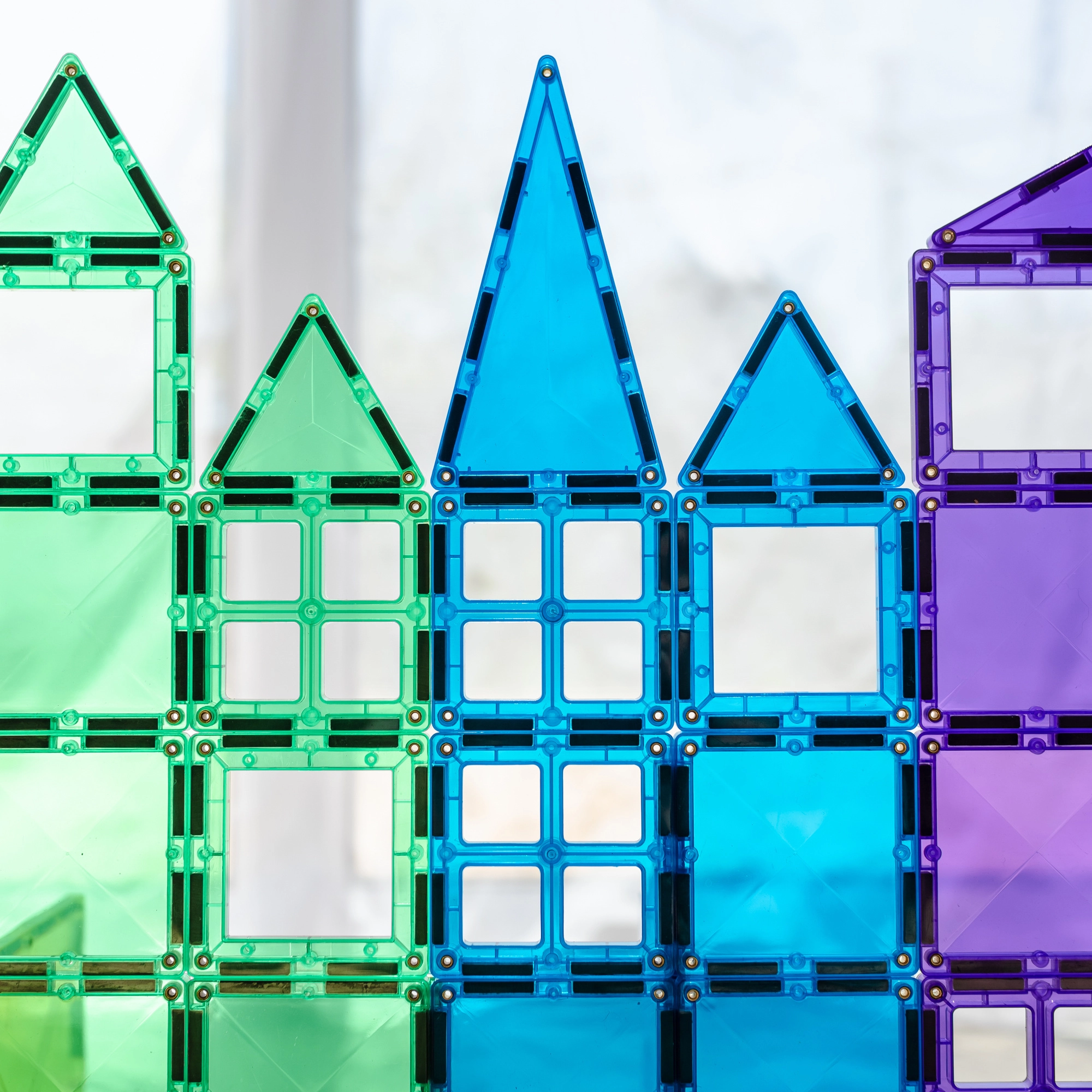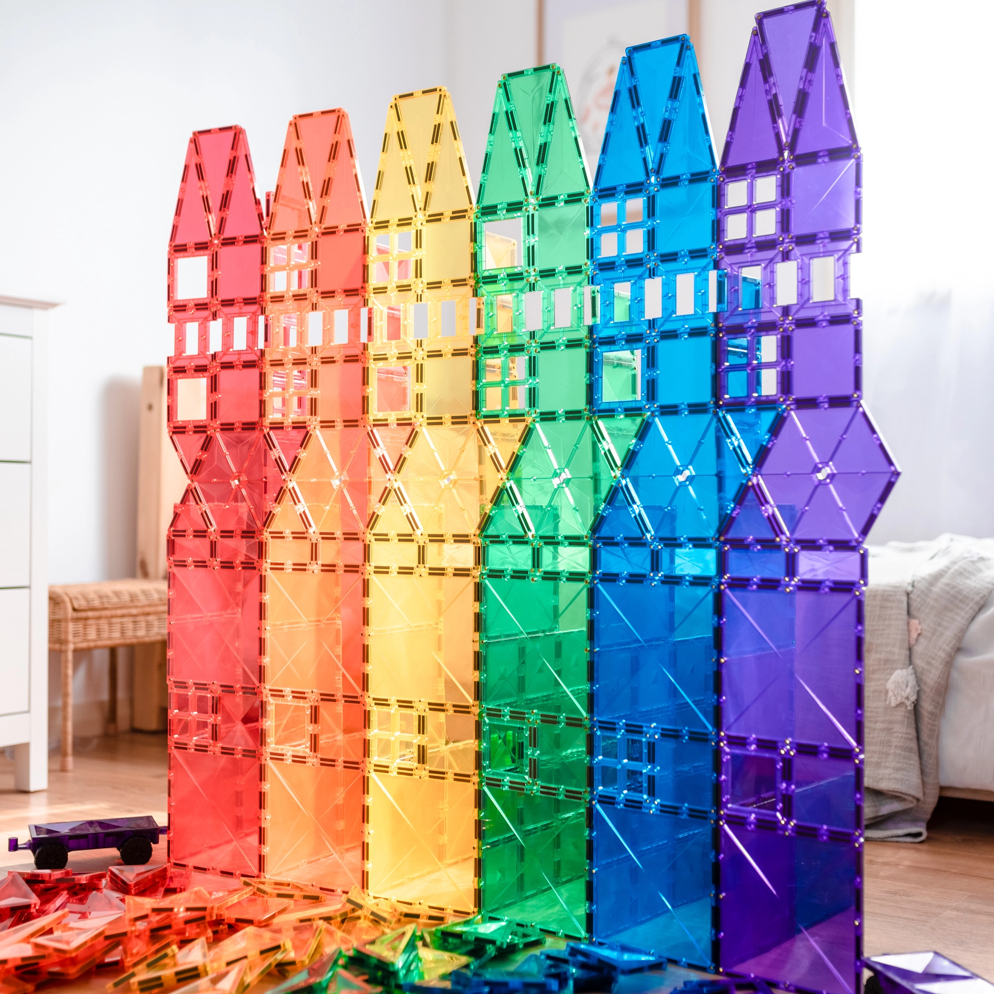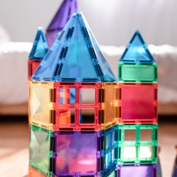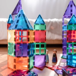Transparante magnetische tegels in rijke kleuren laten kinderen hoge torens, kastelen en huizen bouwen en de wereld van licht en schaduw ontdekken bij het spelen bij het raam of met een lampje.
