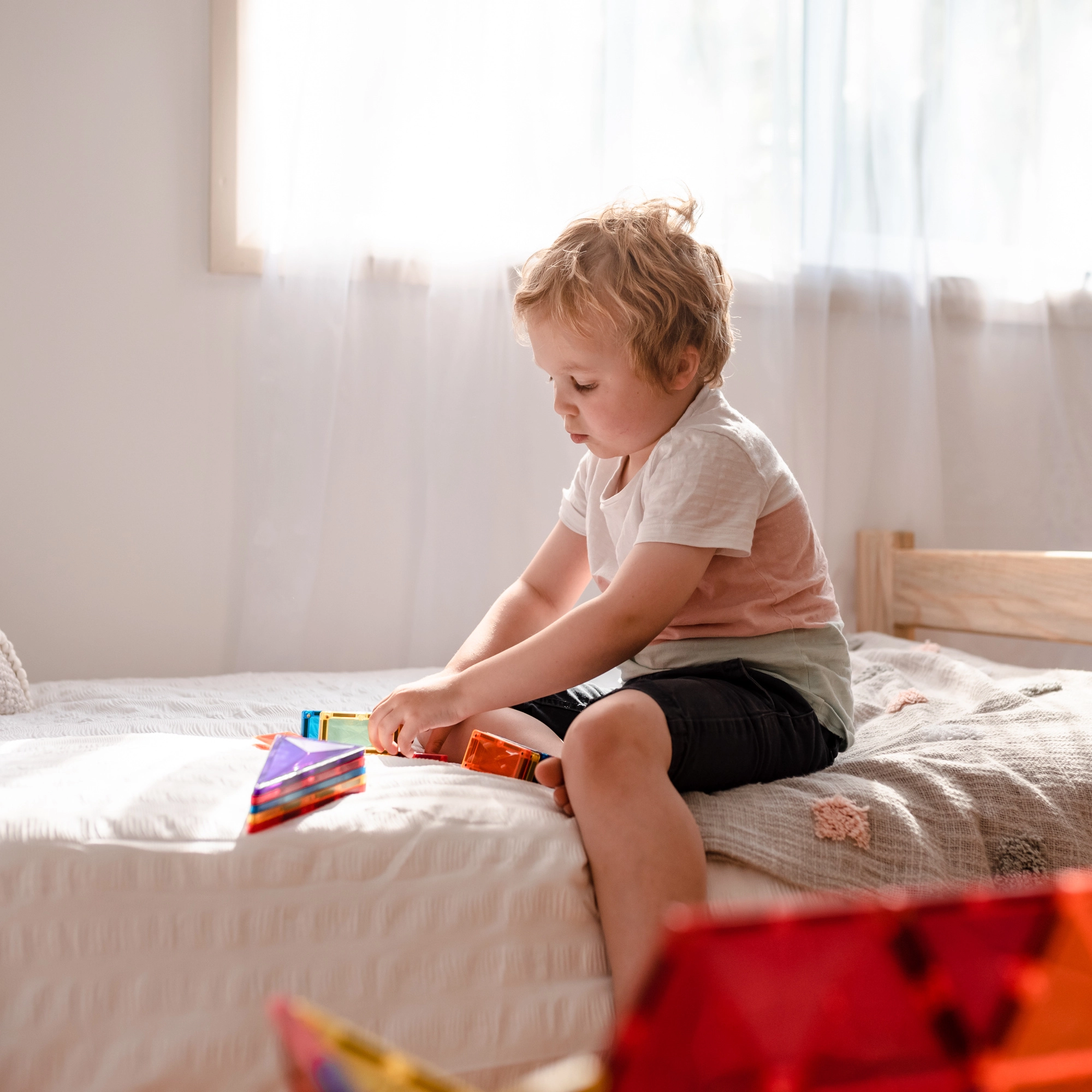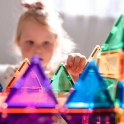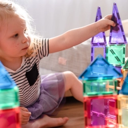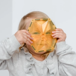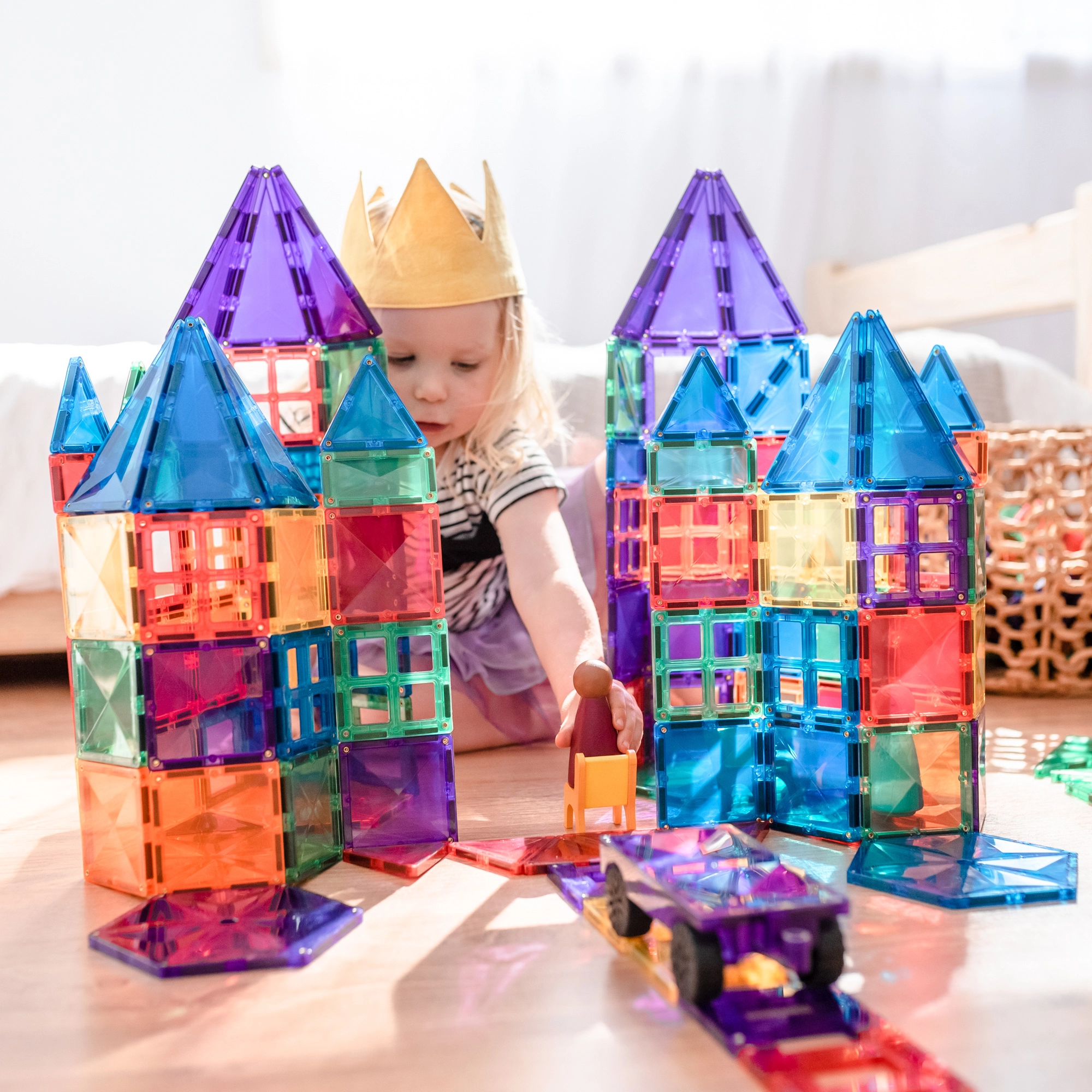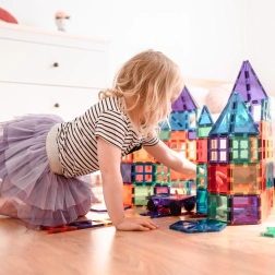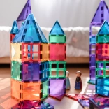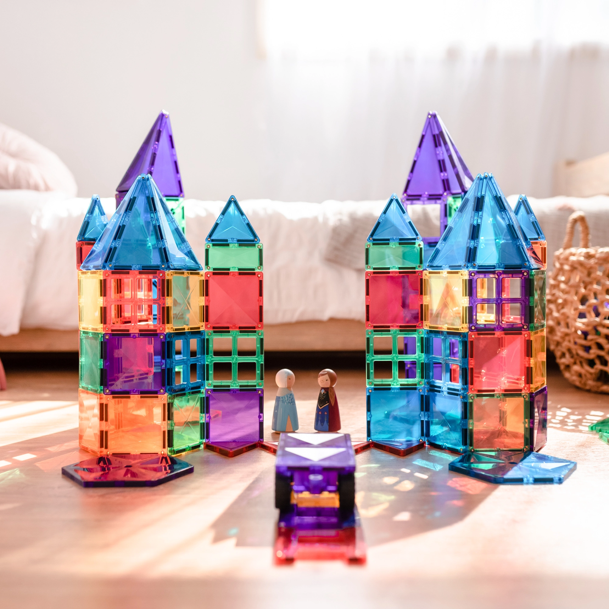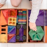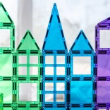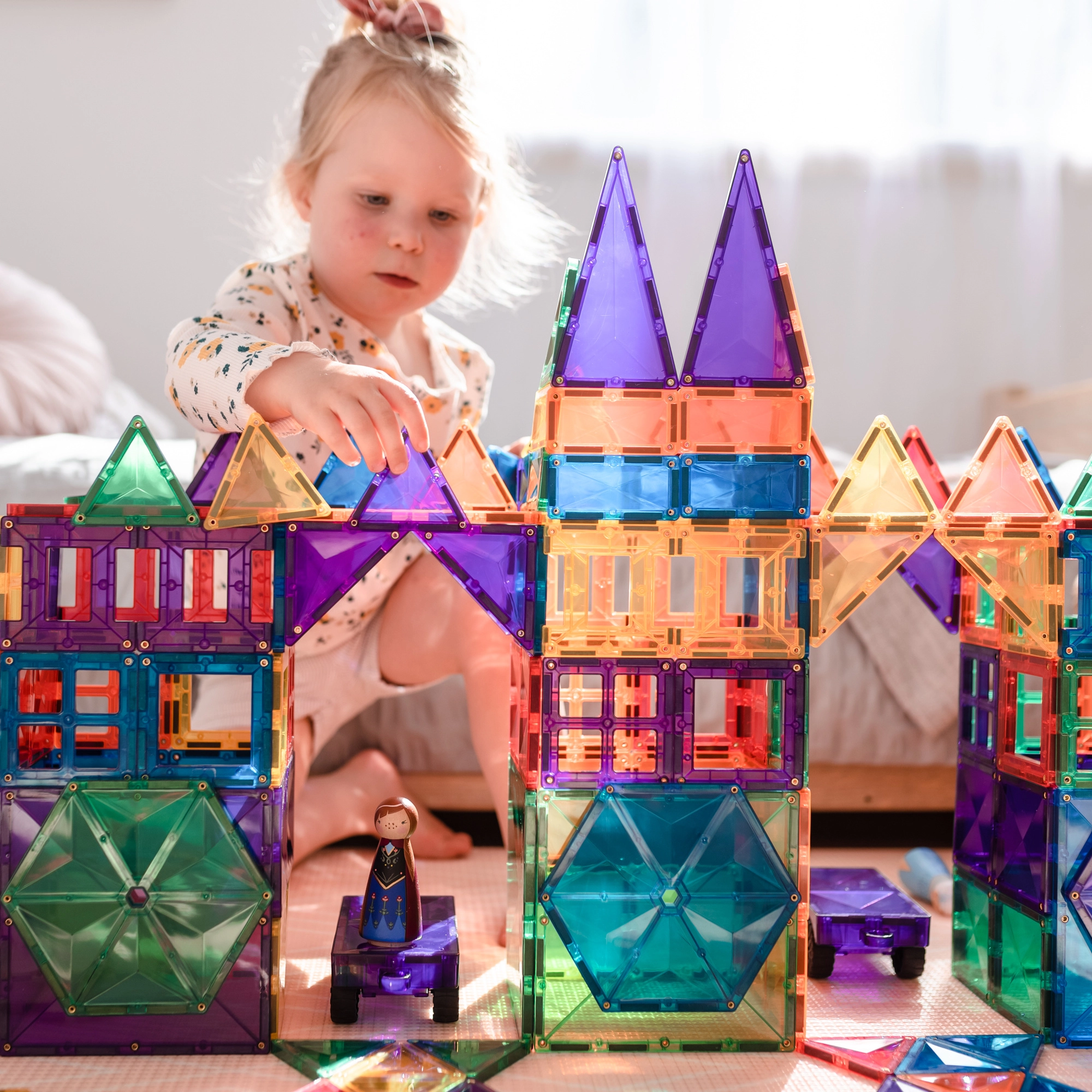Transparante magnetische tegels in rijke kleuren laten kinderen hoge torens, kastelen en huizen bouwen en de wereld van licht en schaduw ontdekken bij het spelen bij het raam of met een lampje.