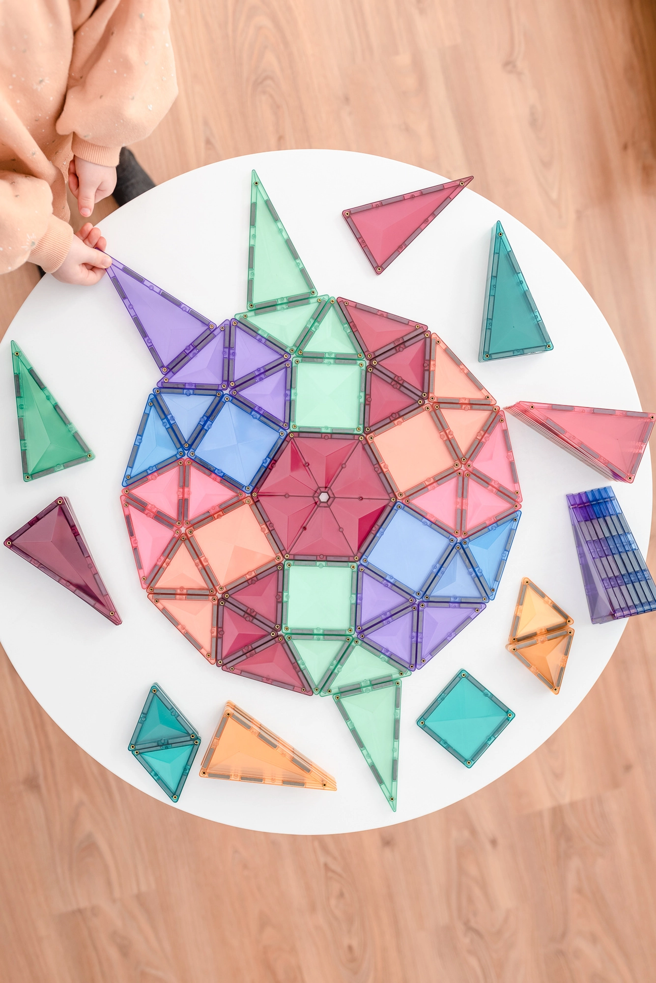 Doorzichtige tegels in zachte pasteltinten zijn kleurecht, gemaakt van duurzaam ABS, met veilig geklonken magneten en afgeronde randen.