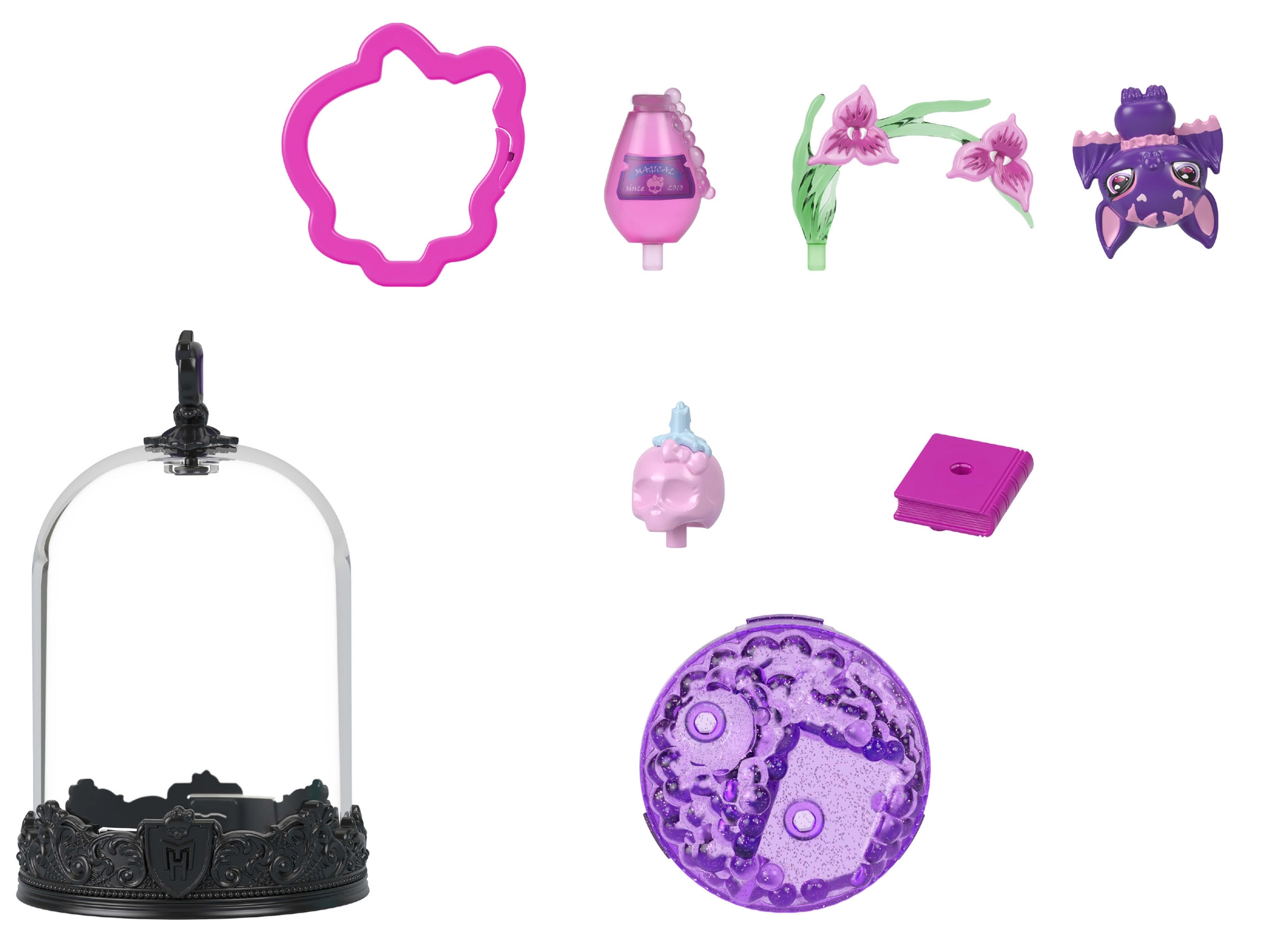 Stap in de stijlvolle wereld van MONSTER HIGH met een sleutelhanger die spel, creativiteit en display in één combineert. In de heldere koepel creëer je voor Count Fabulous – het iconische vleermuisje – een eigen scène met thematische decoraties. Het afgewerkte terrarium klik je eenvoudig dicht en met de clip bevestig je het, zodat je kleine metgezel overal met je mee kan reizen.