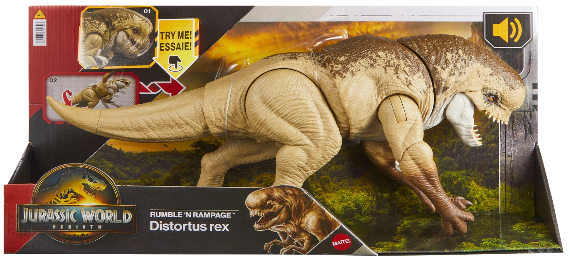 Maak je klaar voor epische gevechten met de realistische Distortus Rex-figuur van ca. 50 cm uit de serie JURASSIC WORLD Rebirth van Mattel. De dinosaurus biedt een angstaanjagende brul via een knop, bijtactie met beweging van de voorpoten en een zijwaartse klap aangestuurd door de staart. Dankzij de gedetailleerde huidtextuur, hoge articulatie en AR-interactie in de app is dit het perfecte cadeau voor jonge avonturiers en dinofans.