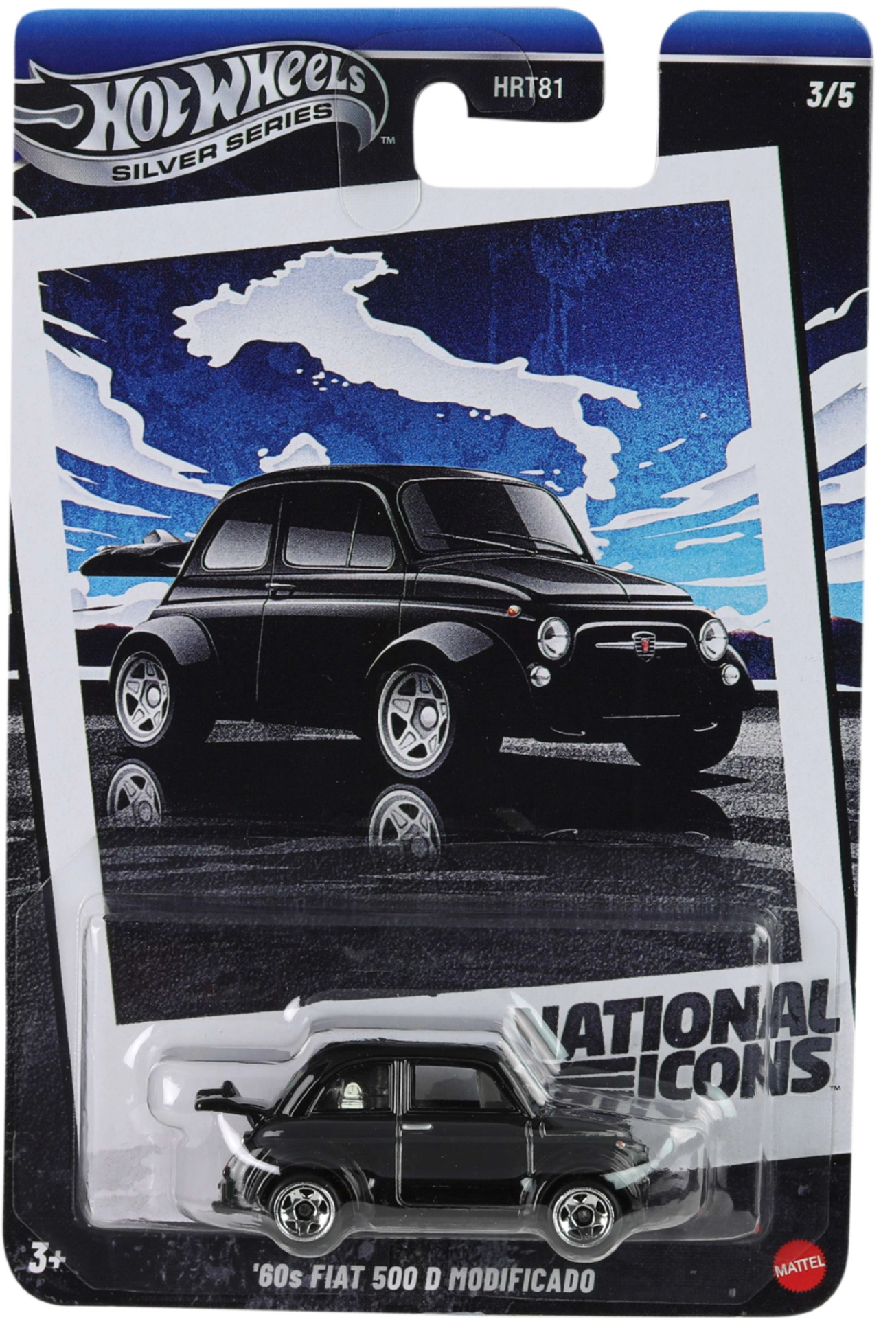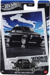 Verzamelmodelauto van HOT WHEELS uit de National Icons-serie: de iconische Fiat 500 D Modificado (1960) op schaal 1:64. Metalen carrosserie, detailrijke afwerking en vrij rollende wielen maken het ideaal om mee te spelen of tentoon te stellen.