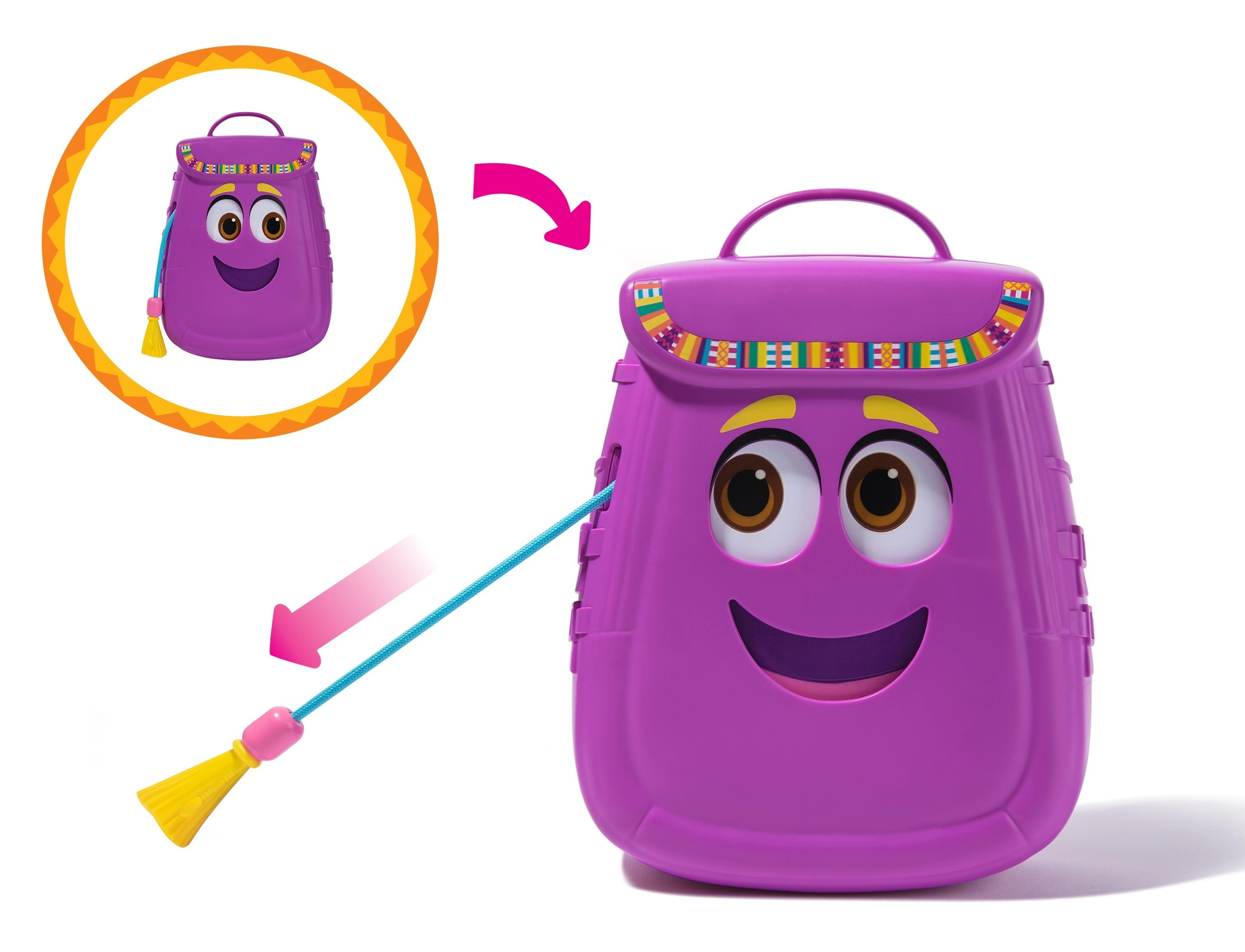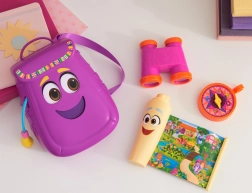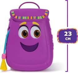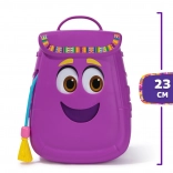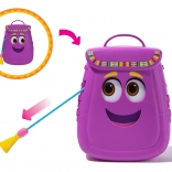 De paarse rugzak met een vriendelijk gezicht heeft een praktische opening en biedt ruimte aan alle meegeleverde accessoires – ideaal voor onderweg en voor thuis spelen.