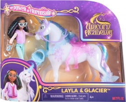 Ontdek de magie van de wereld Sparkle Lake met een set geïnspireerd op de populaire serie UNICORN ACADEMY. De pop Layla in een kleurrijke outfit en de eenhoorn Glacier met blauw‑paarse manen bezorgen kinderen uren fantasierijk spel. Dankzij de gewrichten kun je Layla gemakkelijk in het zadel zetten en dynamische poses creëren.